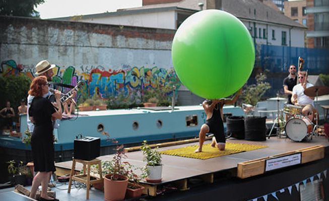 With the help of a volunteer, our talented performer uses a voice-activated vacuum cleaner to inflate a six-foot balloon. Then, to the audience's amazement, wearing only bright lycra shorts and moving to choreographed music, he slides completely into the balloon. First his head, then his torso until finally, the last leg slowly disappears. Once inside, he dances to a fast-paced mix of music, sure to make the audience laugh.