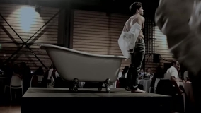 An extraordinary aerial performance showcasing incredible upper body strength with aerial straps and a suspended bathtub!