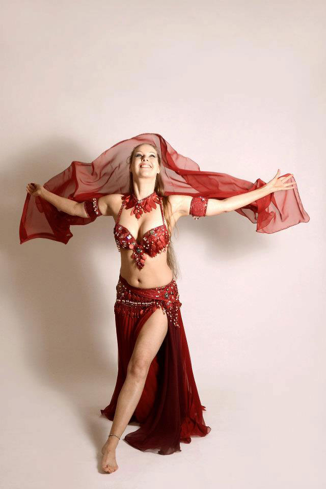 Her belly dance routine takes audiences on a magical journey to the Orient with graceful choreography, gorgeous costumes, and swirling colored silks. The play of light and color creates a stunning visual that captivates her audience. A musical rhythmic accompaniment in the form of a drummer can be added to her show on request. She is also capable of performing an oriental fire dance.