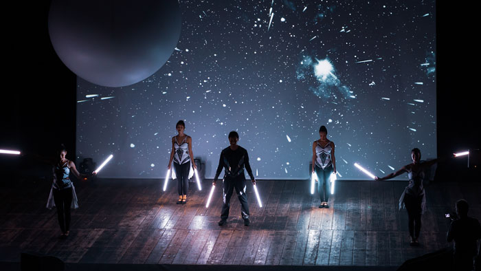 Highly energetic choreography with seamless, constantly changing LED graphics synchronized to music