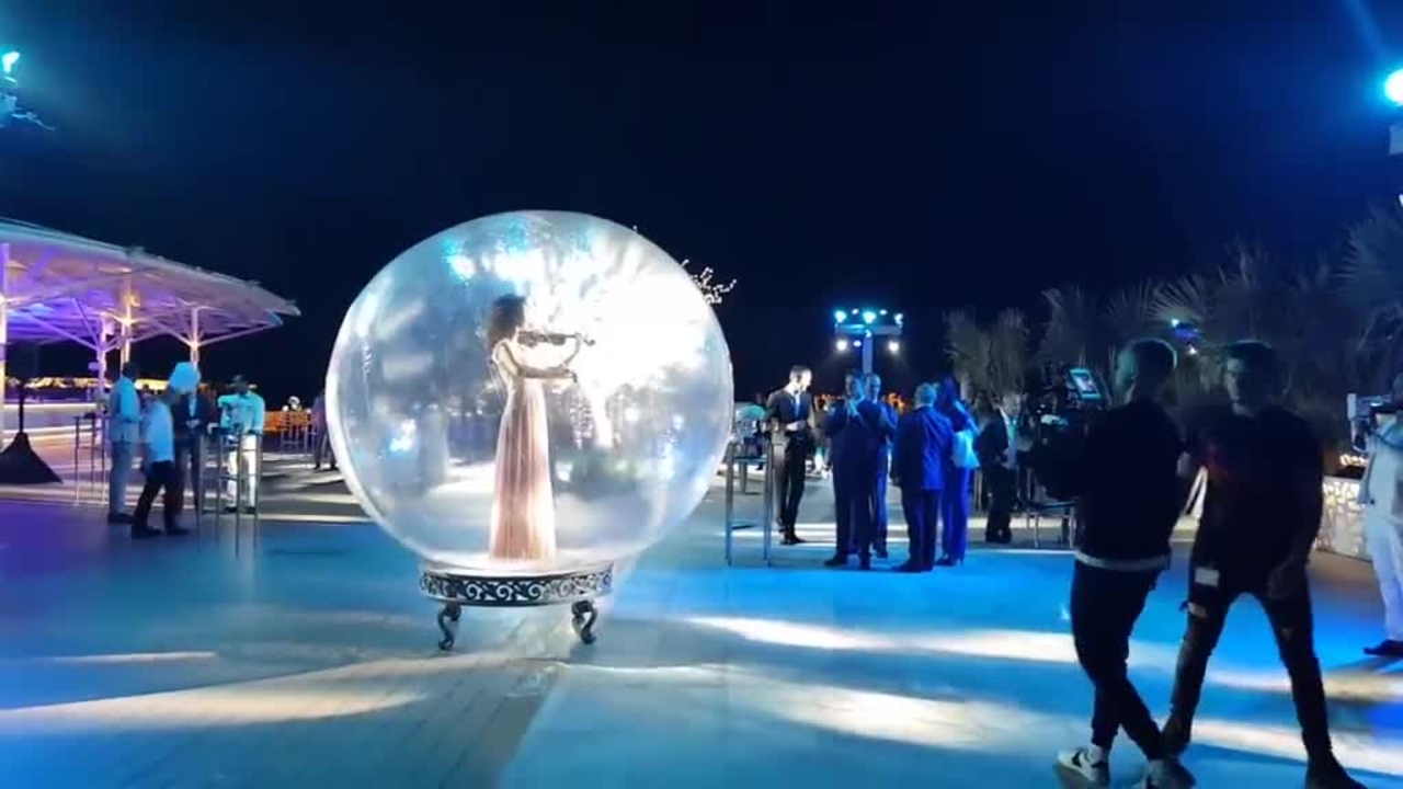 This stylish female solo violinist performs ambient classical and pop covers inside a transparent sphere