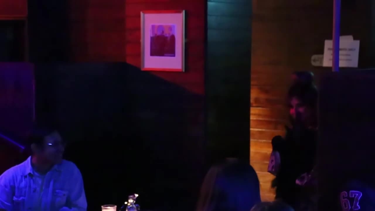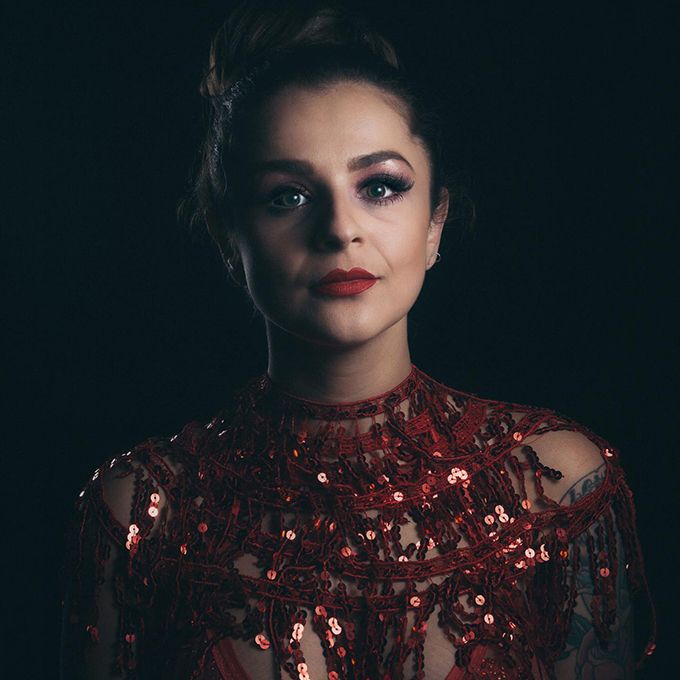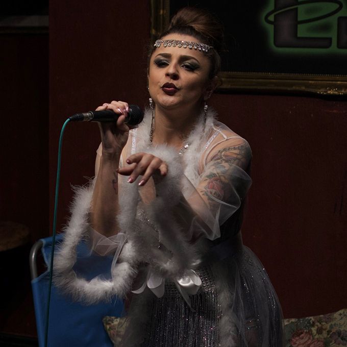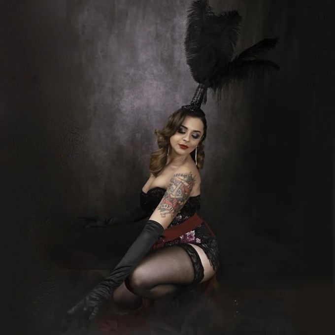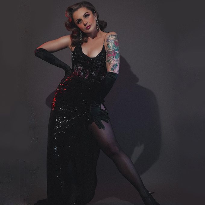 This burlesque performer boasts a background in musical theatre and enthralls guests with her captivating stage presence