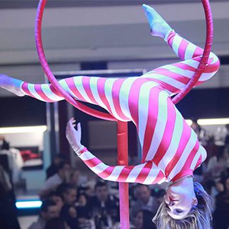 Choose performers from various disciplines, including stilt walking, aerial acrobatics, candy ladies with a cart, bubble and fire performers