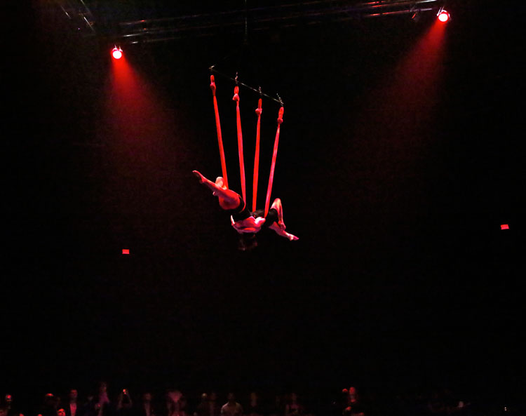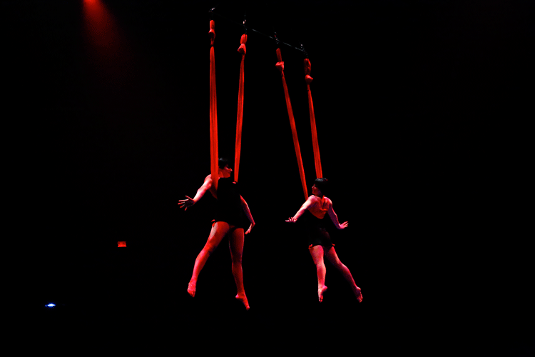 In addition to her chair aerial routine, our circus performer also performs as part of a duo, with each artist becoming a reflection of the other, breaking the illusion by blending into each other and synchronizing their movements to appear as one. A stunning performance that offers a variety in aerial styles.
