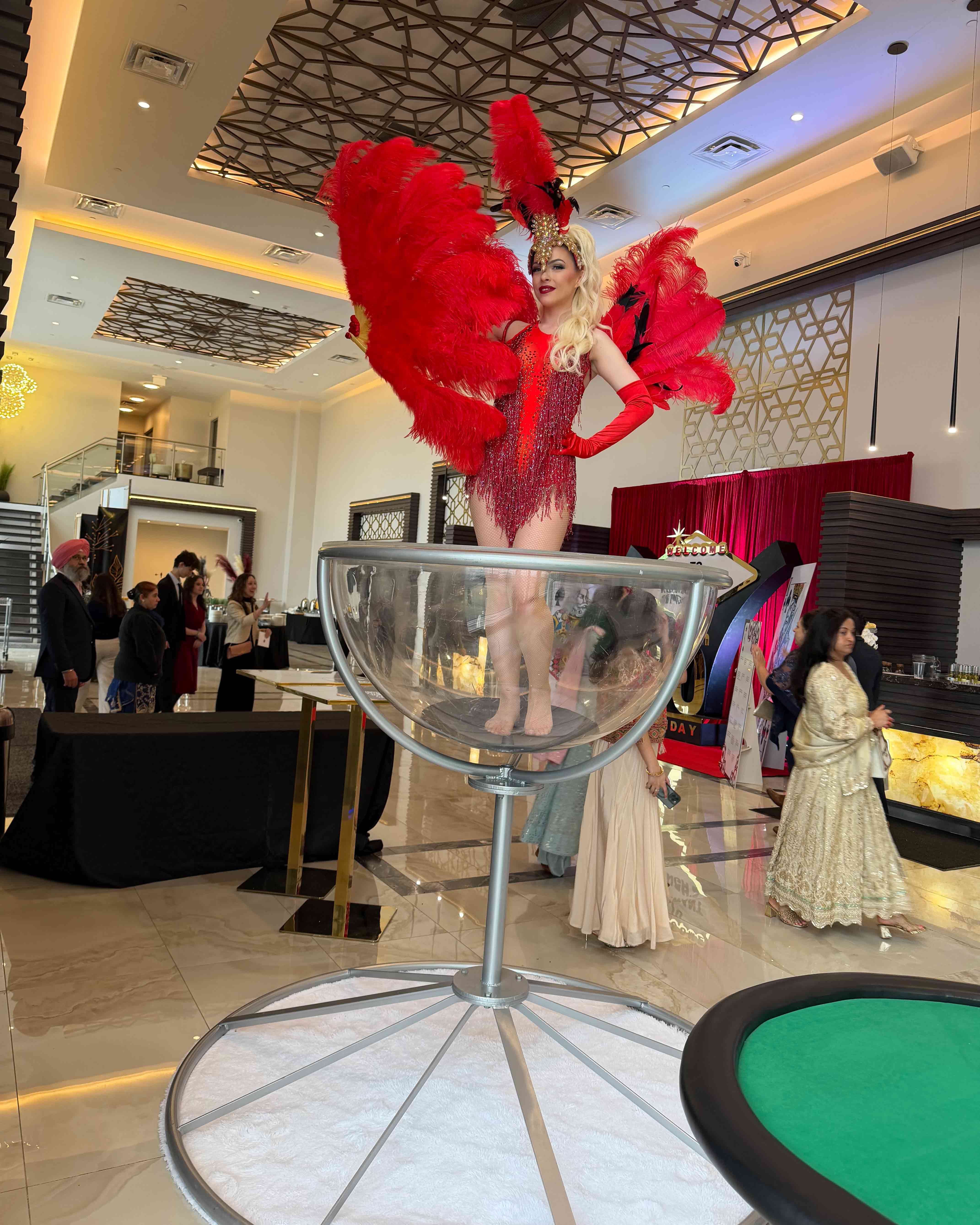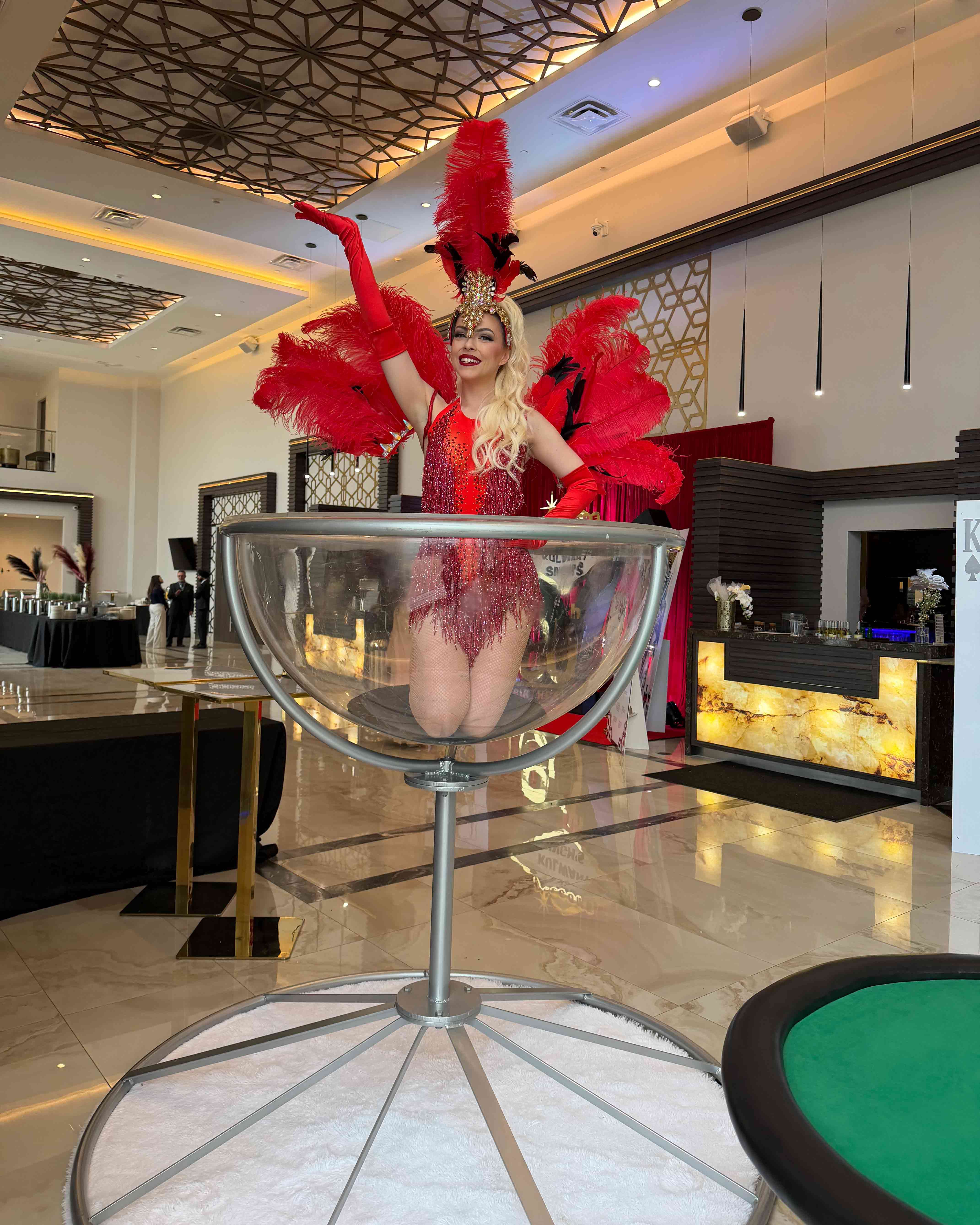 Our giant martini glass can feature a burlesque dancer with fans or a boa, a contortionist, or various other entertainment options to wow your guests.