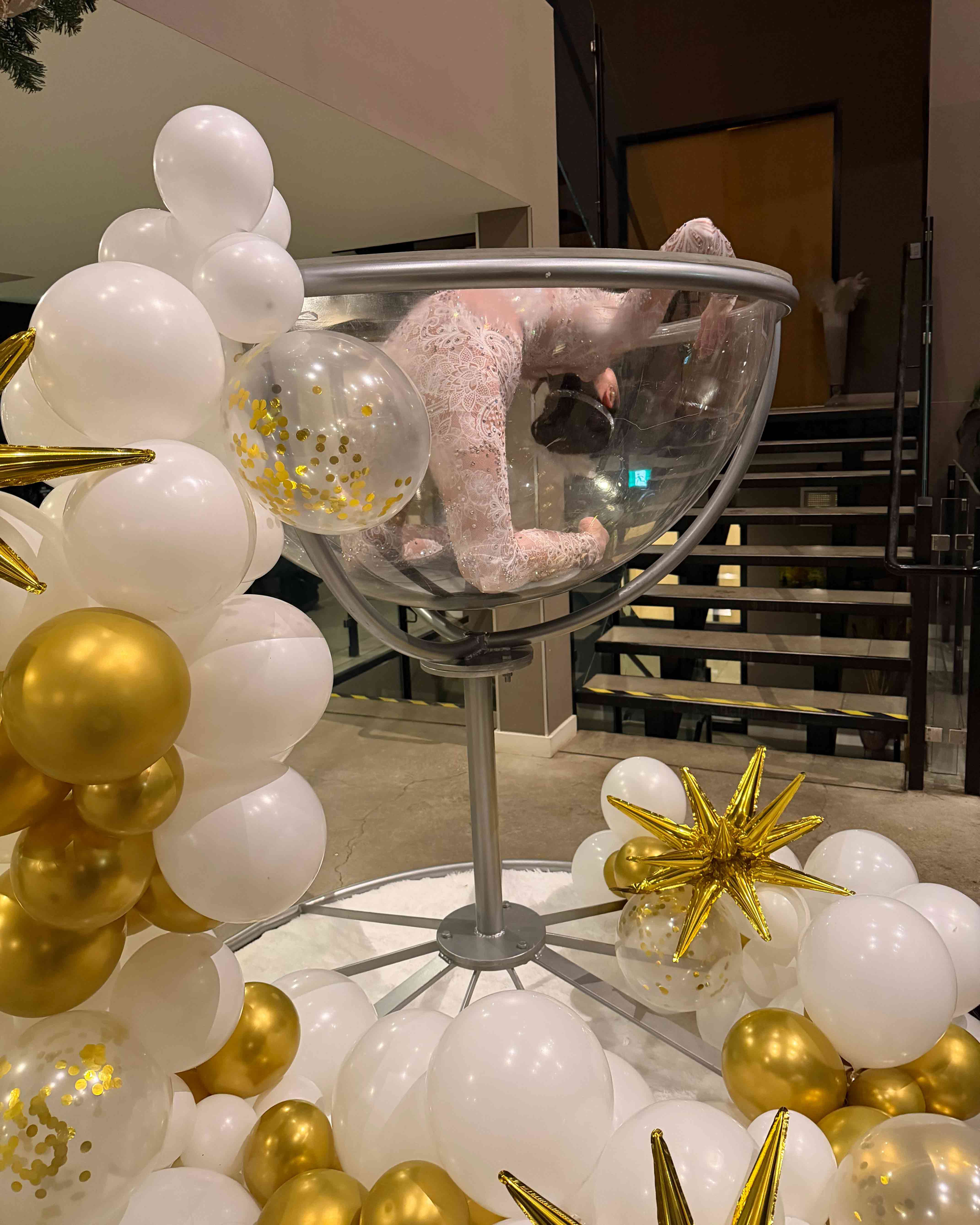 A giant champagne glass where a model can greet guests and pose for photos, perfect for sharing on social media
