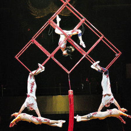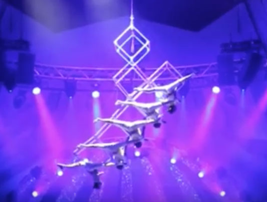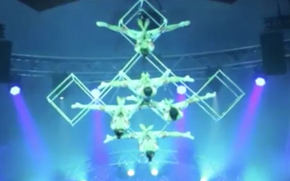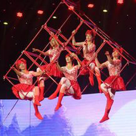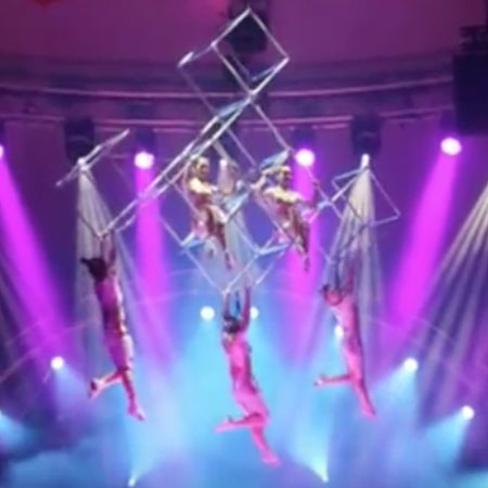 This extraordinary Chinese circus act features a unique aerial prop, designed like an aerial cube with multiple cube structures fused together, allowing the entire acrobatic dance troupe to perform collectively. Manipulated by the dancers' movements, the structure changes shape throughout the show. Combining floor acrobatics, dancing, and aerial artistry, our Chinese stage show will leave your guests spellbound.