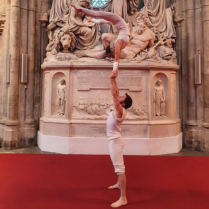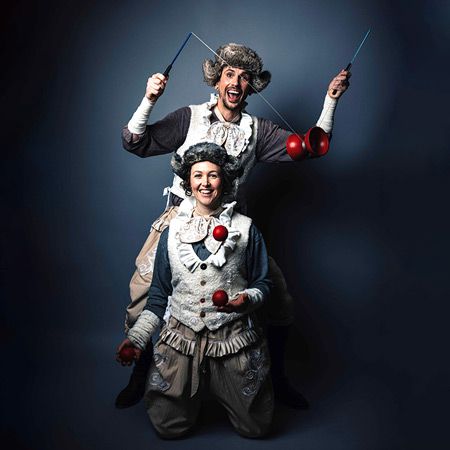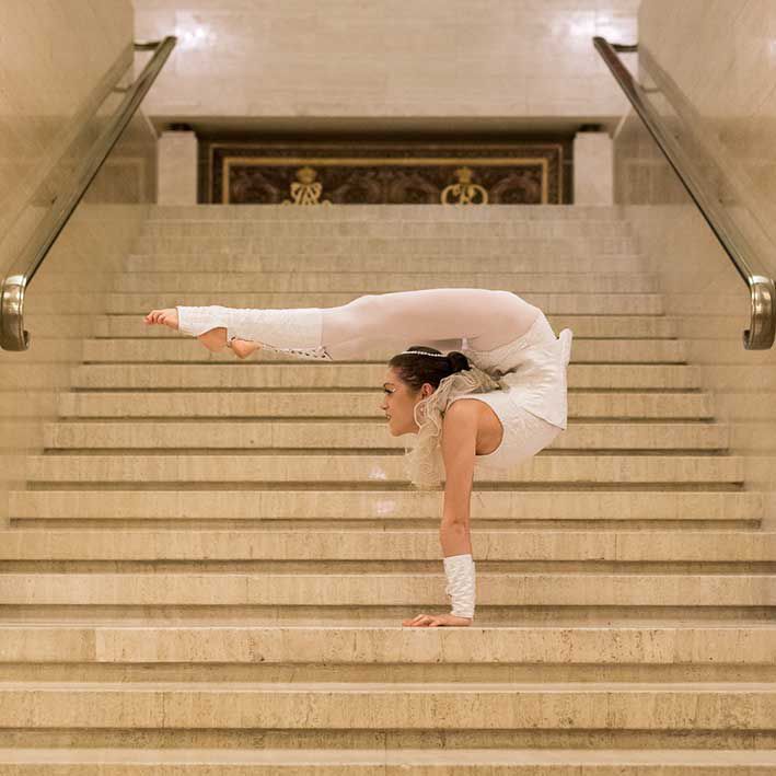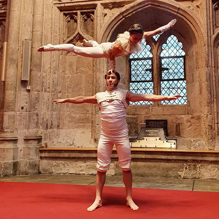 - Floor-based: Frame girl is just like all of us—a fan of the selfie. Dressed in a beautiful vintage costume and holding a frame, she can pose for photos with your guests while juggling. The interactive acrobatic duo will also grab attention with their incredible contortion, balance, and icy outfits.