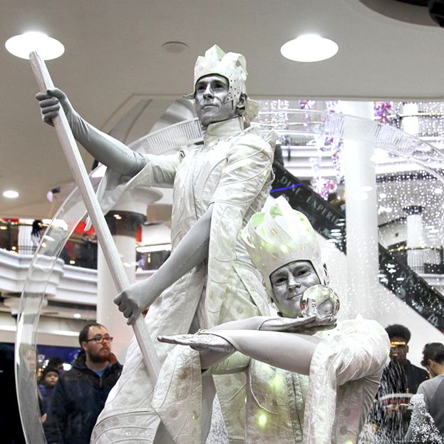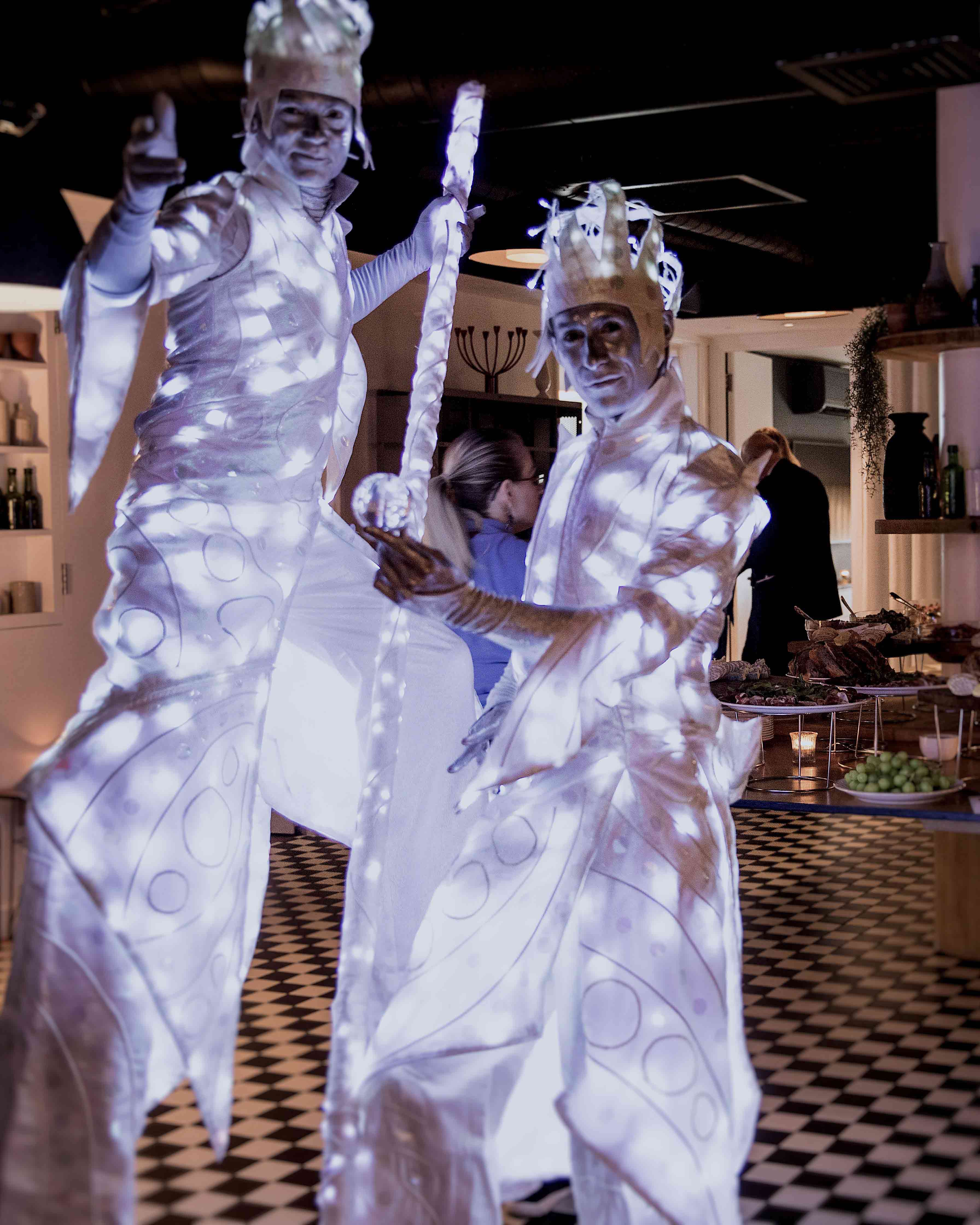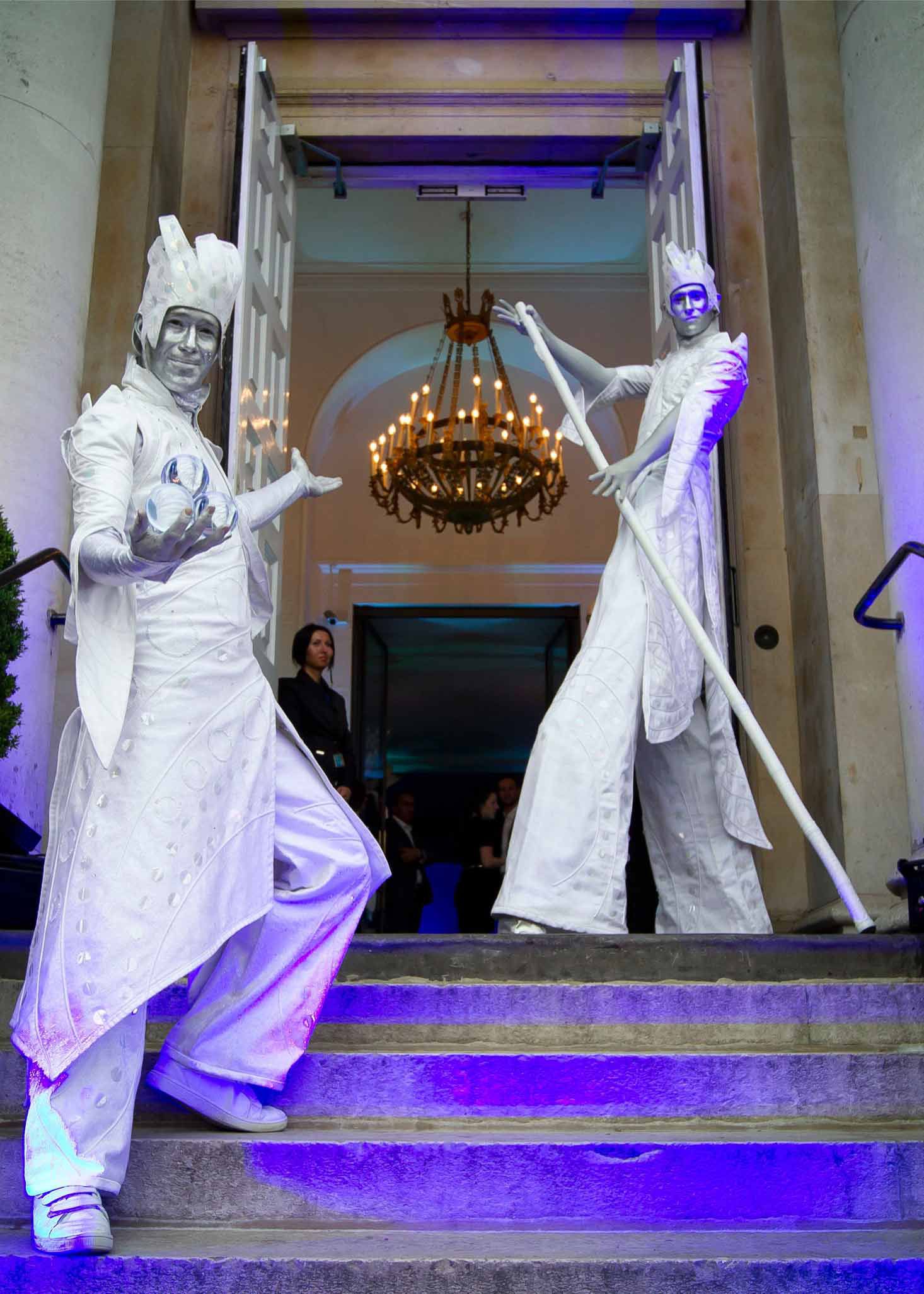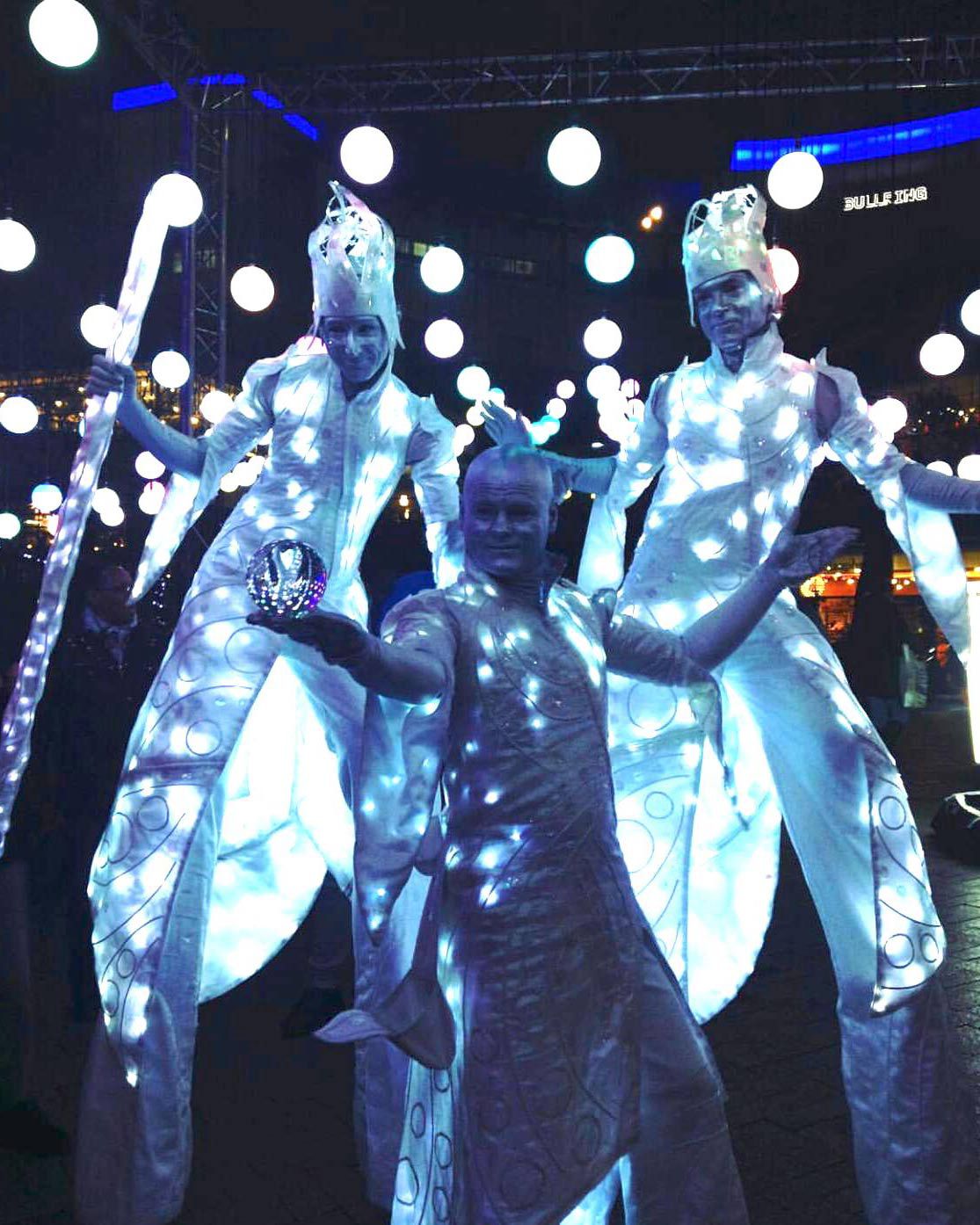 Glass balls seem suspended in mid-air, unusually tall characters freeze and move in mysterious synchrony, and a magical soundscape surrounds them all. Calvos can perform as either ground-level crystal ball jugglers or stilt characters—or both—in the same booking...