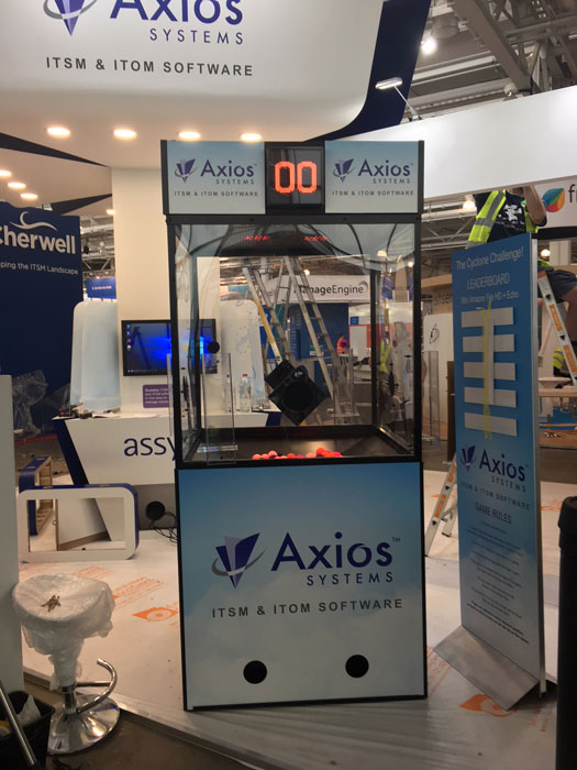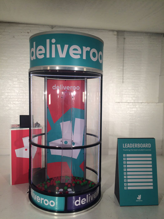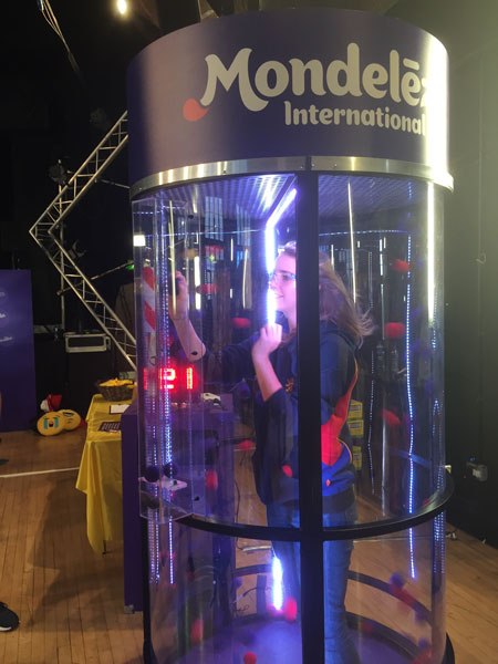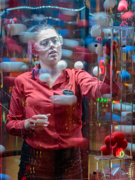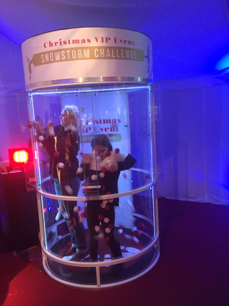 This innovative design features a Perspex cylinder where air is blown to create a cyclone of hundreds of colored foam balls. The challenge for the participant inside is to catch as many of the right colored balls as they can and feed them into the chambers built into the side of the cylinder. There’s a time limit, so it’s a race against the clock to win!
