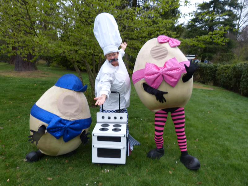 As trained performance artists, these eggs are fantastic improvisers ready to jump into any situation they encounter and make it amusing. They especially love to dance and can teach kids of any age the secrets of their hilarious, eggy dance moves. They might start a conga line through a garden party or waltz romantically through a shopping center.