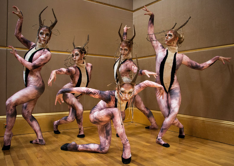 The stunning choreography includes ballet dancers prancing and leaping across the stage like gazelles, while the aerial performers descend from high above, adding a theatrical tone to any event!