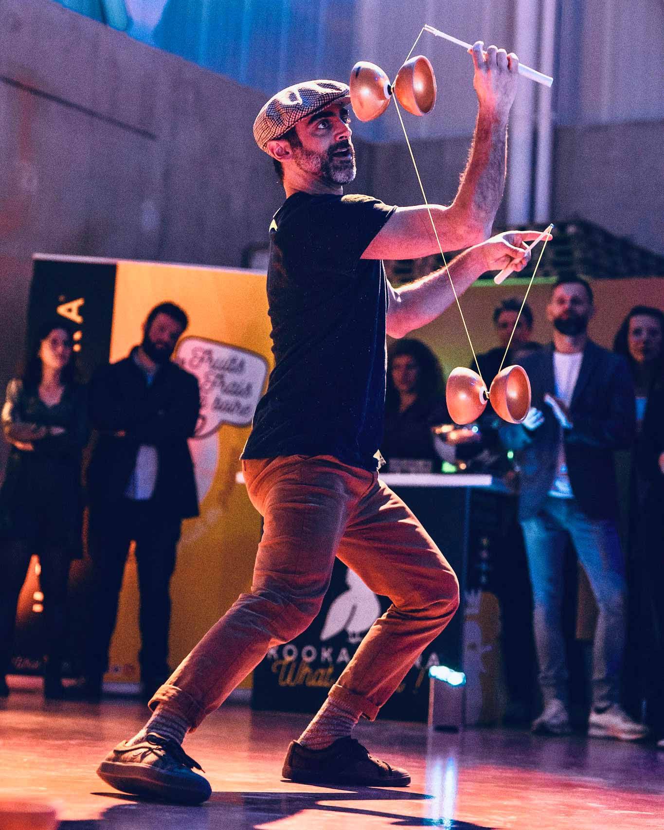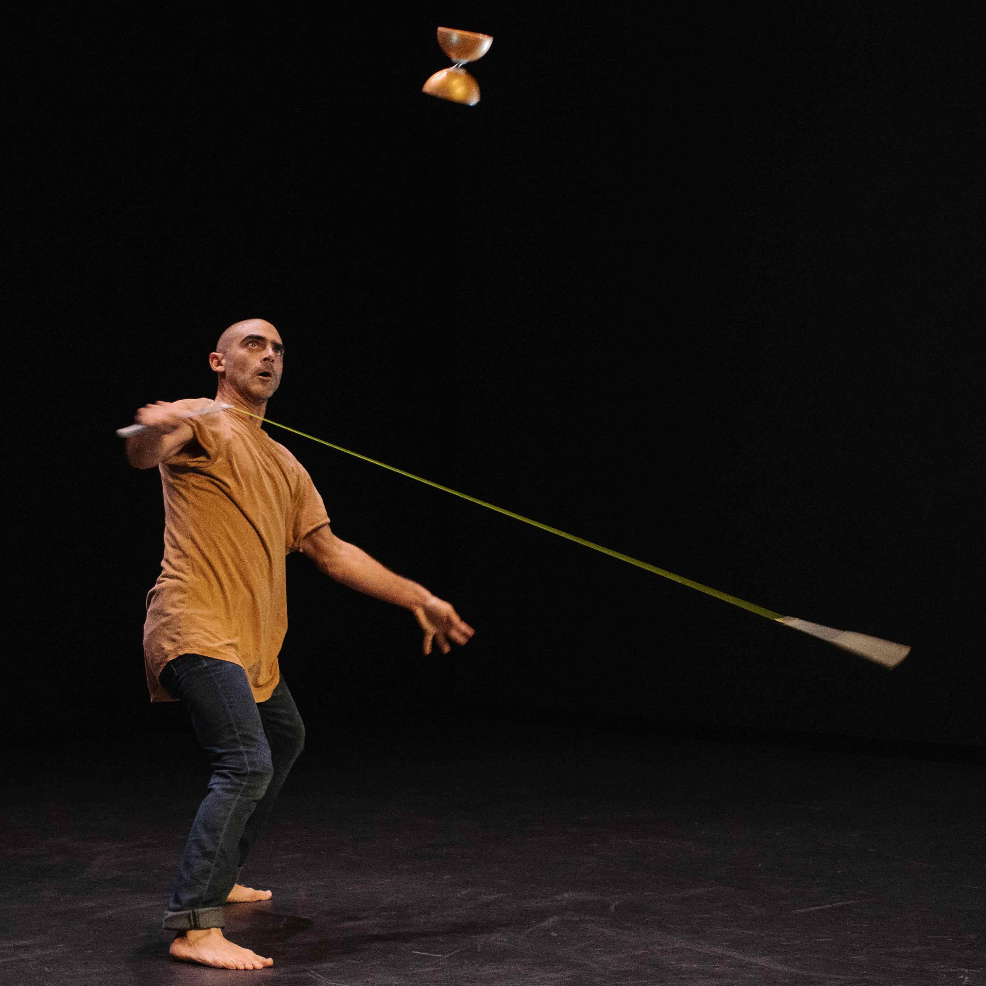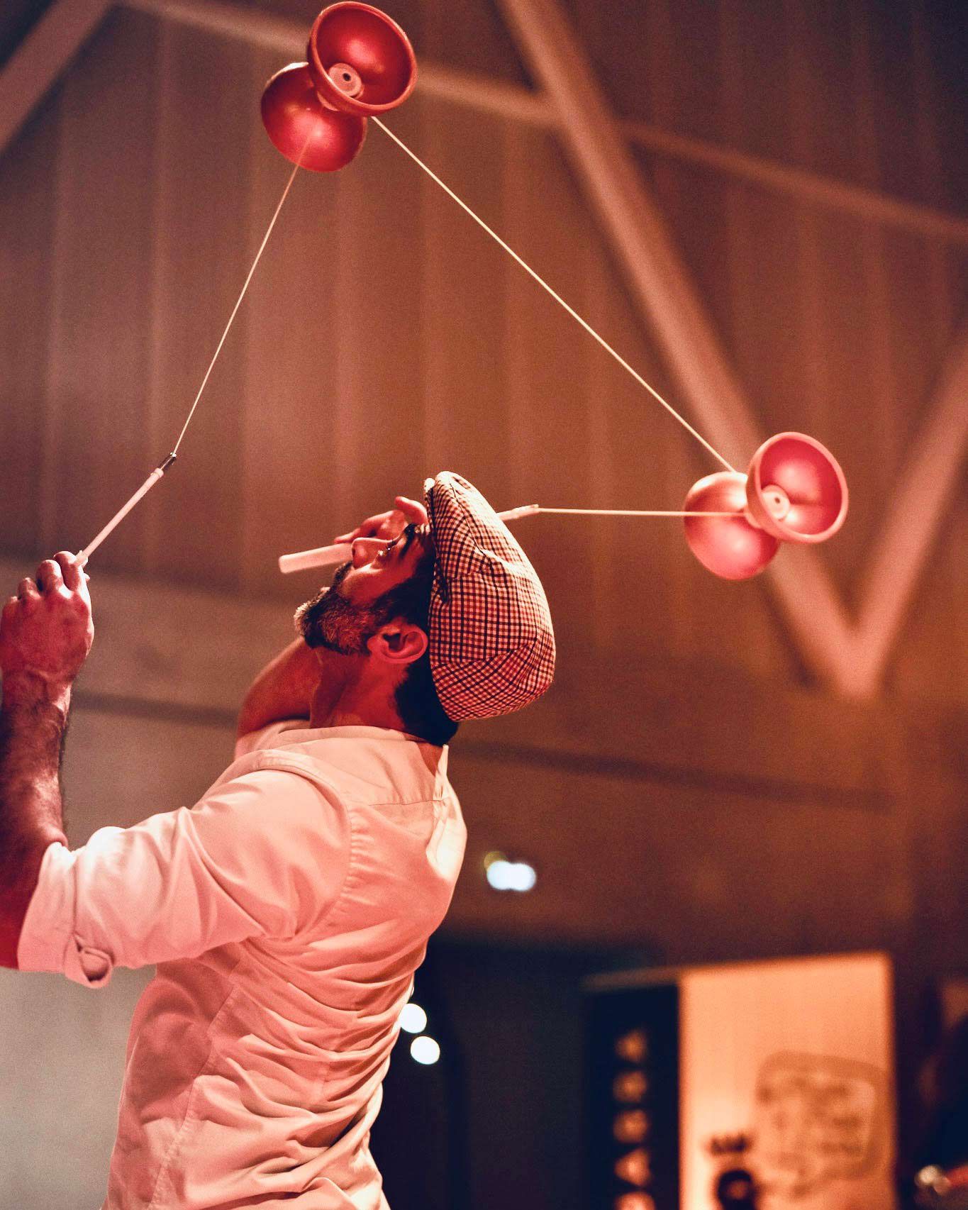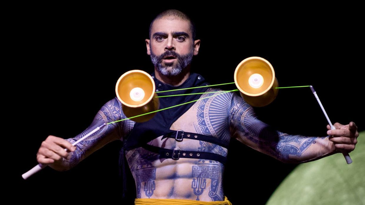 This performer blends expert juggling skills with high-energy routines, performing with multiple diabolos at once and showcasing complex tricks