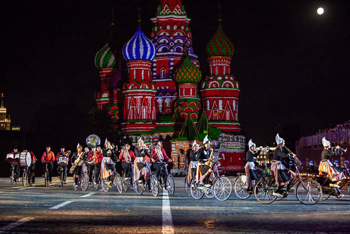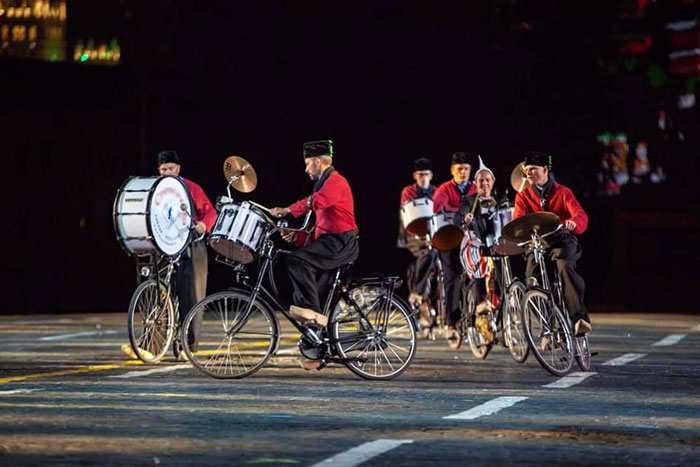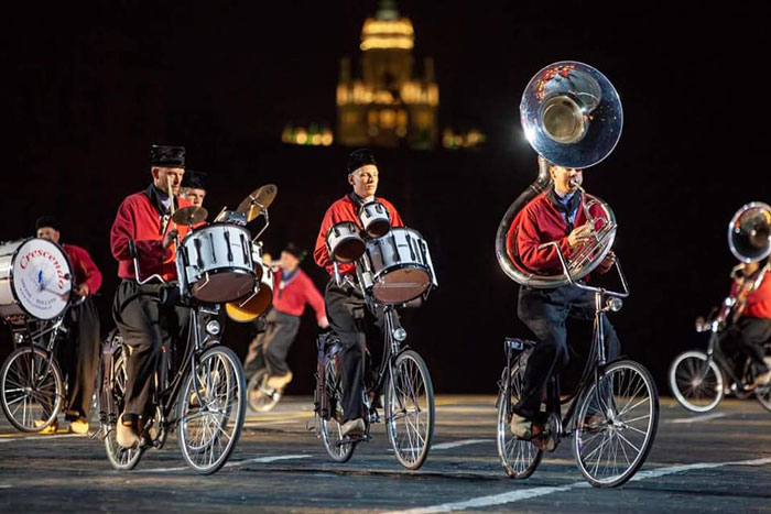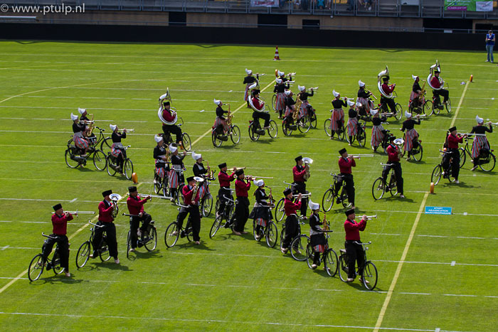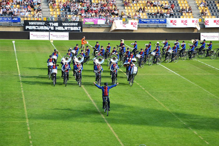 A complete Dutch marching band that performs while riding bicycles, creating incredible formations.