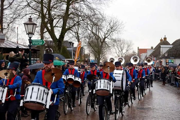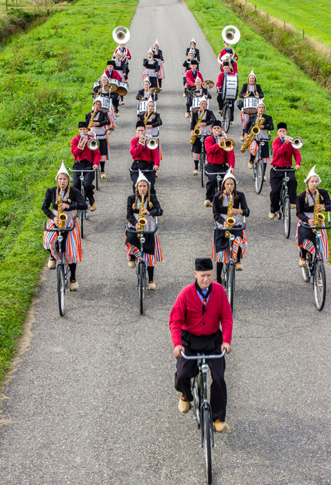 They provide a red and blue marching band costume or traditional Volendam outfits complete with wooden clogs.