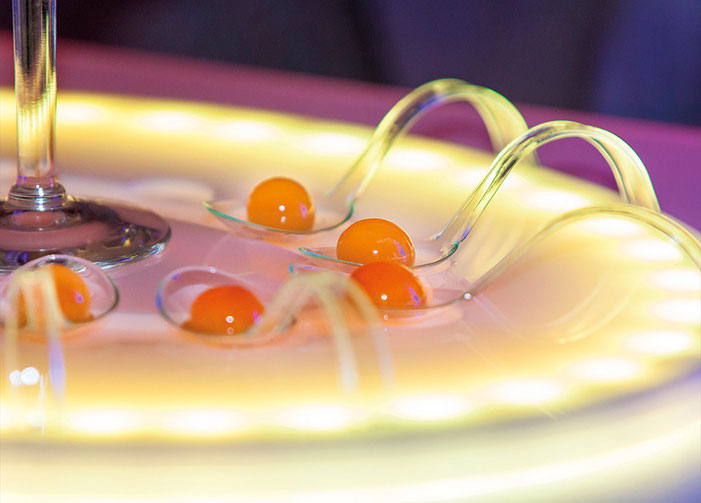 Our 2.5 cm diameter cocktail flavor pearls are completely liquid on the inside. Each guest can enjoy up to six cocktail grapes. The sensations and flavors experienced during tasting will be described by a group of mixologists, who will also explain the quality of the ingredients used.