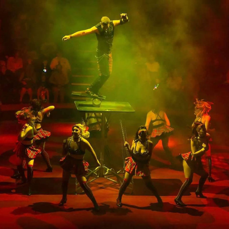 Featuring an awesome rock and roll theme set to high-energy rock music, our teeterboard artists deliver a one-of-a-kind show with punk costumes, flames, and electrifying guitar solos.