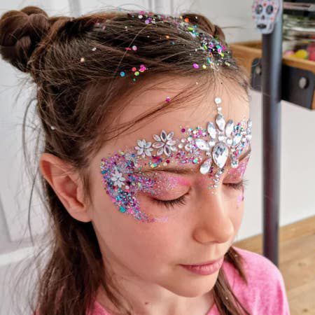 Designs range from unicorns and dragons to glitter flowers, as well as glitter tattoos and themed creations for Halloween and other occasions