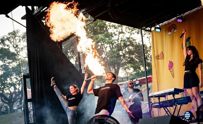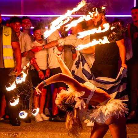 Performing on the ground or on stilts, these artists use a range of fire props including hula hoops, fire staffs, fire breathing, fire fans and poi