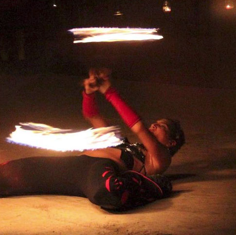 This talented fire artist delivers a mesmerizing fire “dance” full of power and grace, whether using poi, hoop, staff, or fans.
