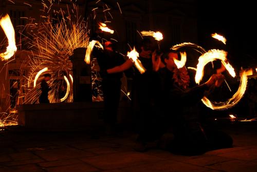 Fire breathing, jugglers, poi, fire eaters... all perfectly synchronized to music.