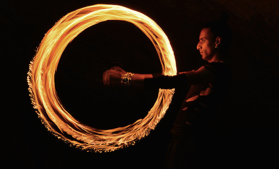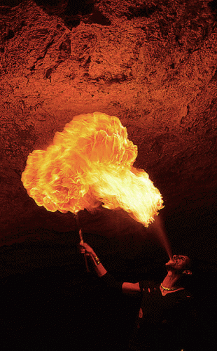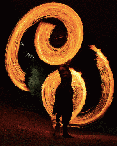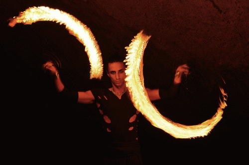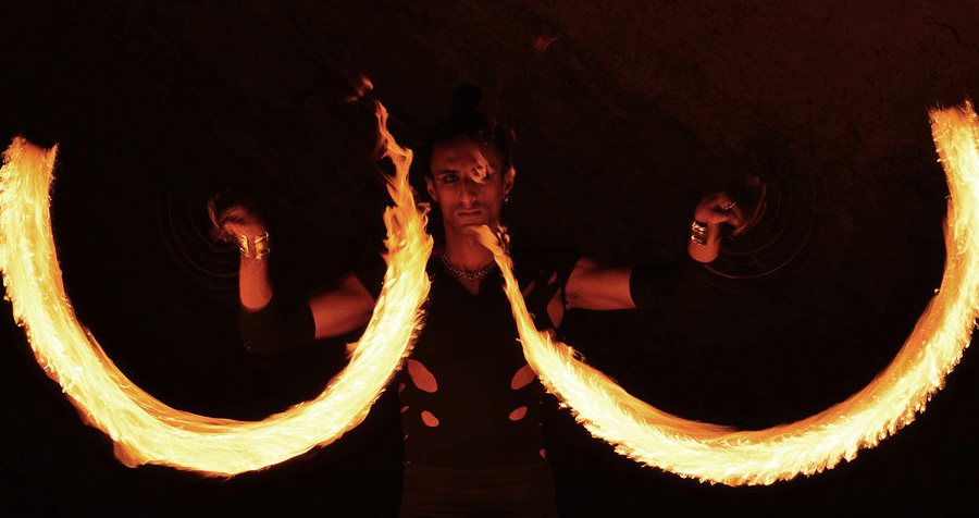 High-energy, breathtaking fire show features fire juggling and fire breathing