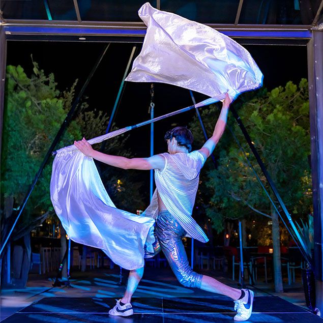 Specializes in manipulating diverse props such as flags, cubes, hula hoops, rifles, and LED shapes, offering striking visual variety