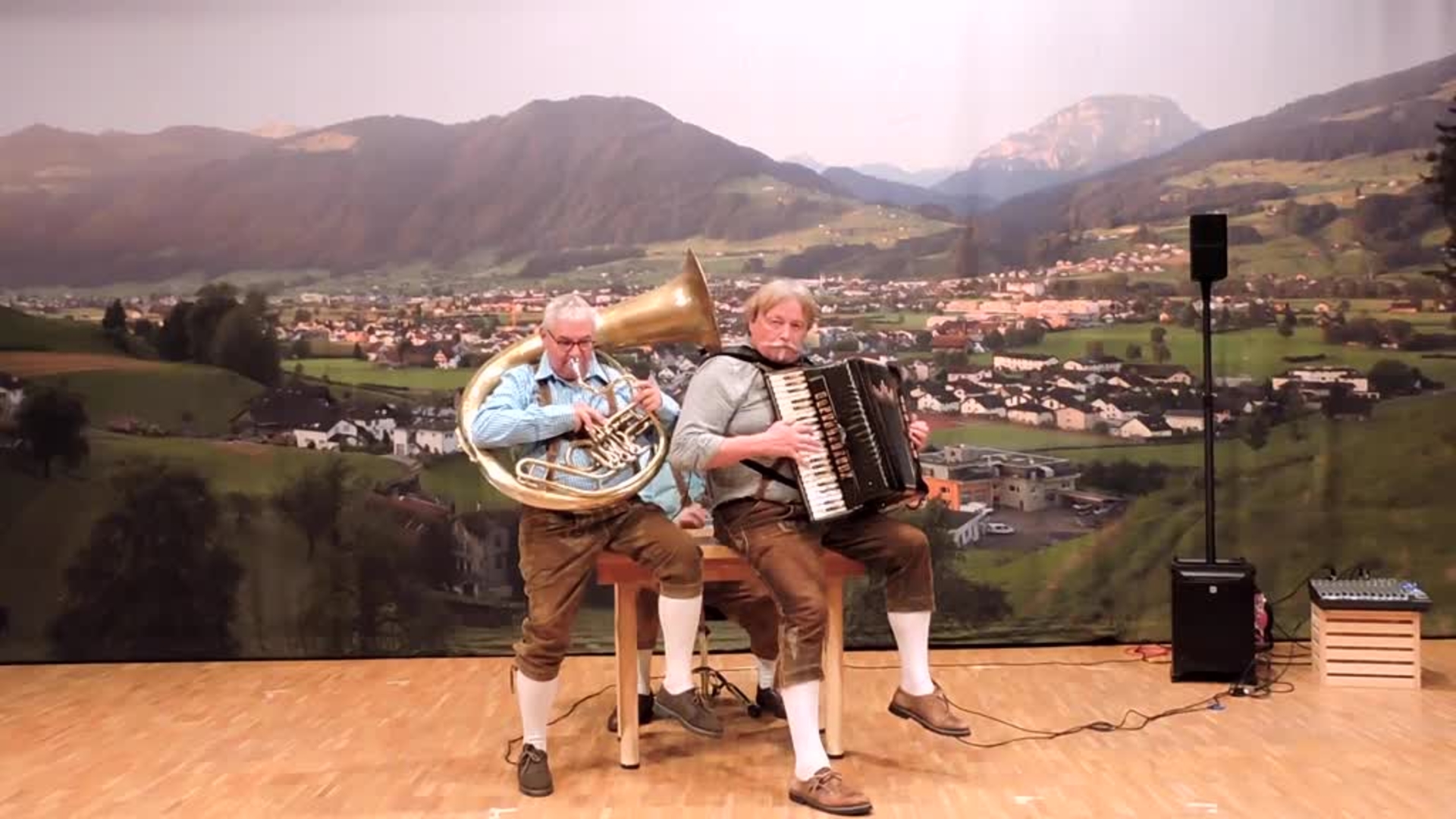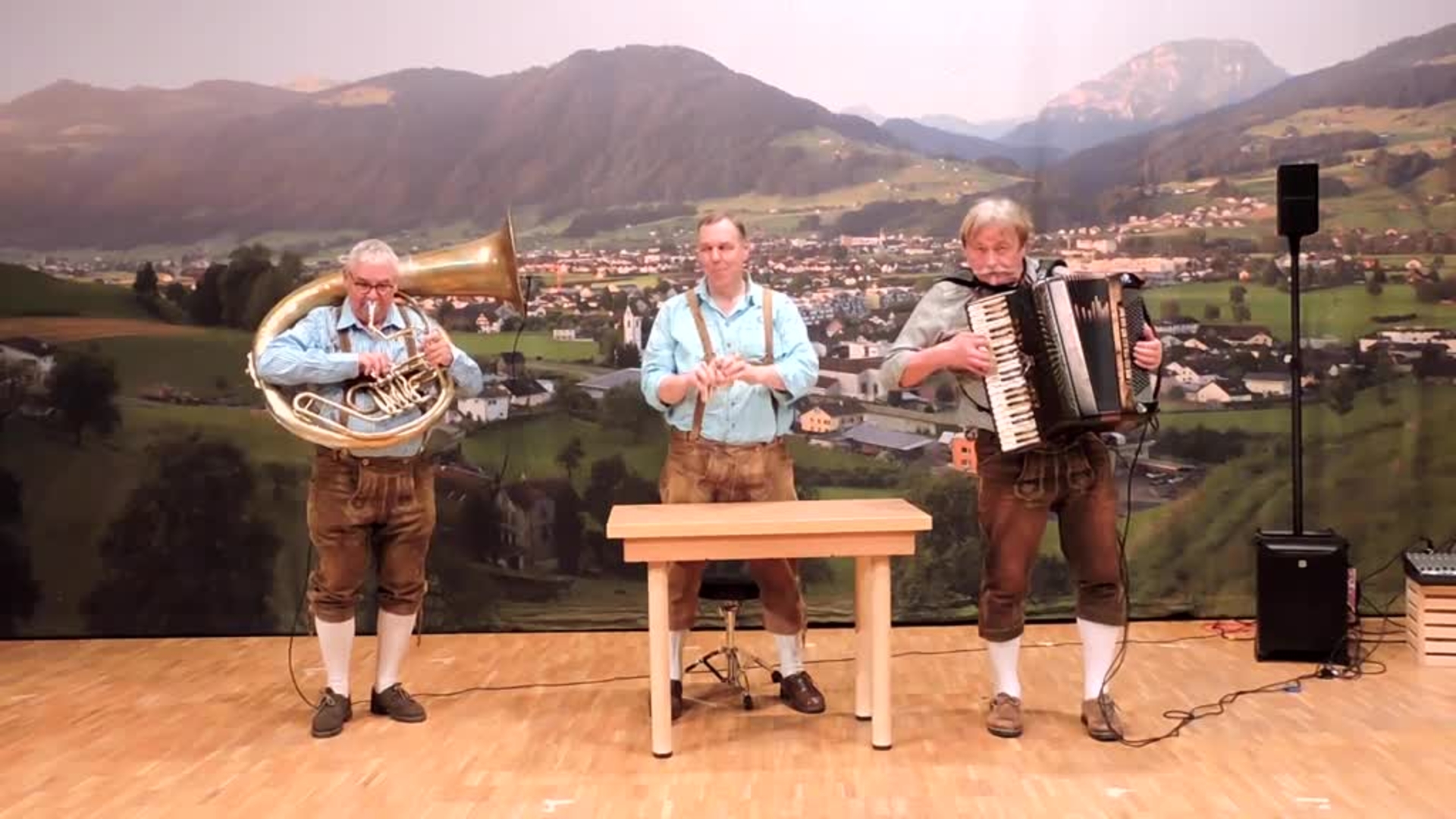The all-male group features a sousaphone, Swiss horn, accordion, and a TV talent show star on the castanets.