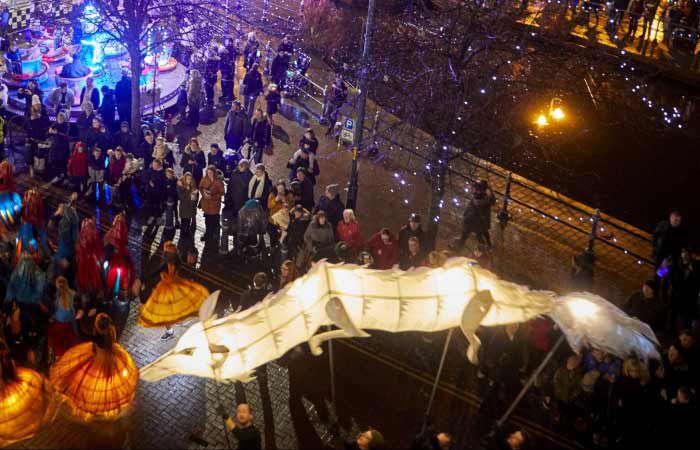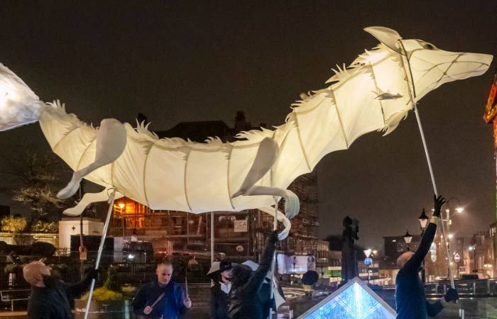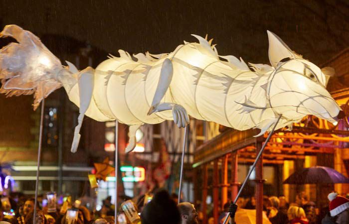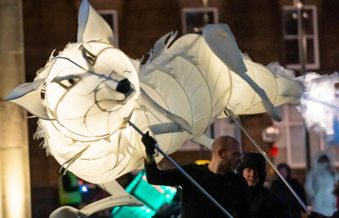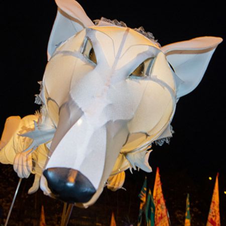 Inspired by the myth of the Arctic fox that creates the Northern Lights, our puppet soars above the crowd, sending sparks into the night sky.