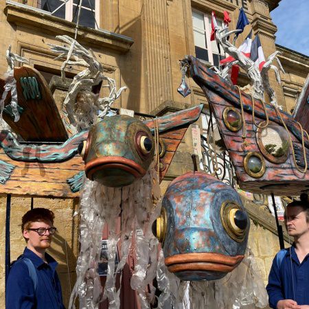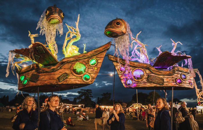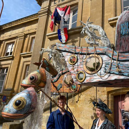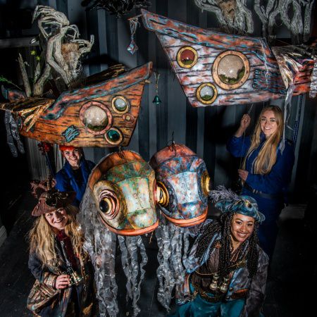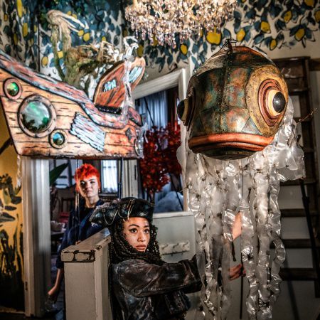 Be amazed as our pirate puppeteers maneuver their magnificent flying ships through the audience, followed by two curious fishheads.