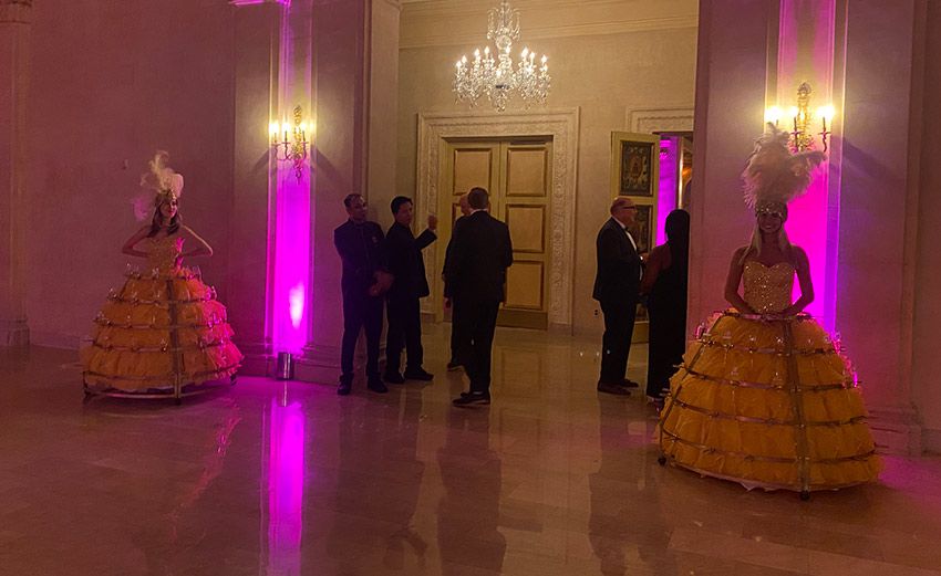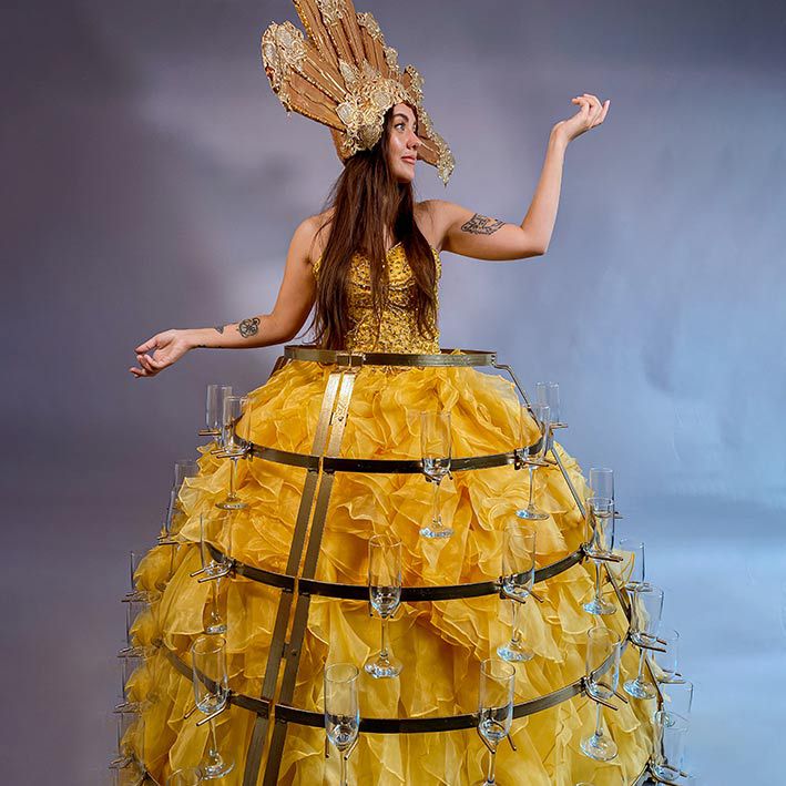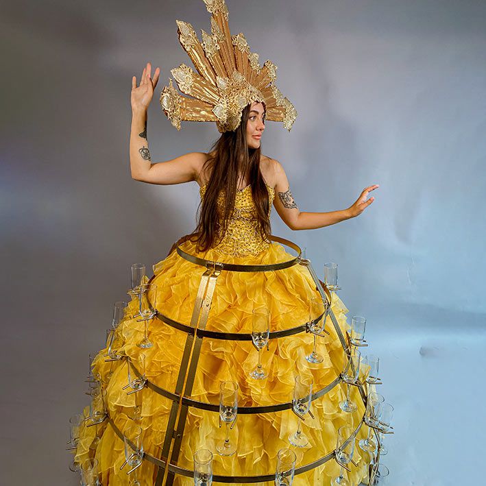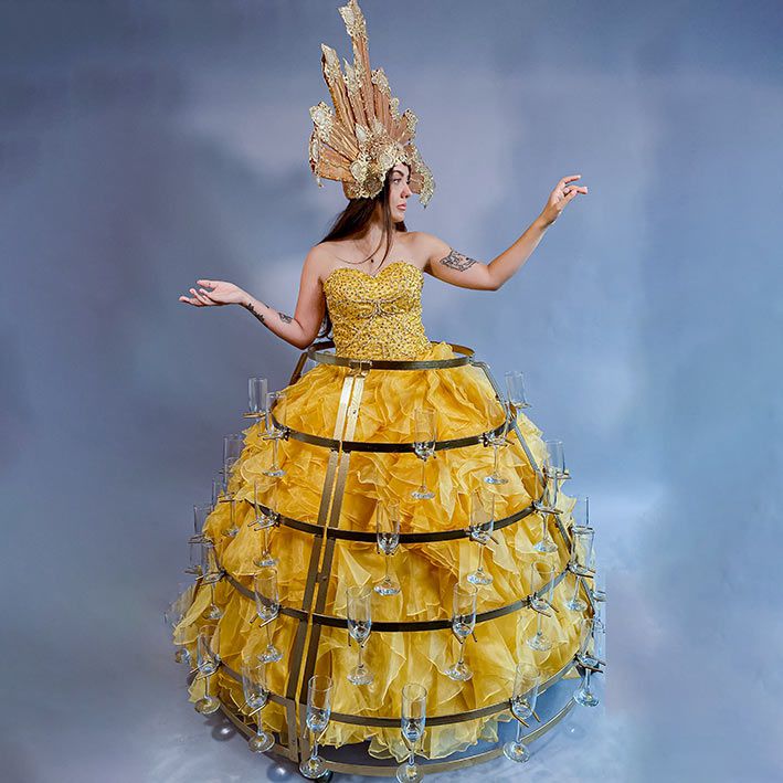 This stunning gown adorned with champagne glasses and an extravagant gold headpiece makes this act a highly Instagrammable entertainment choice.