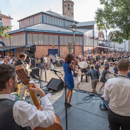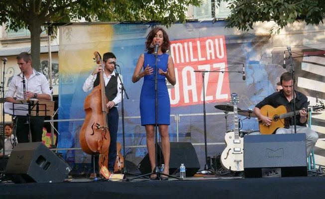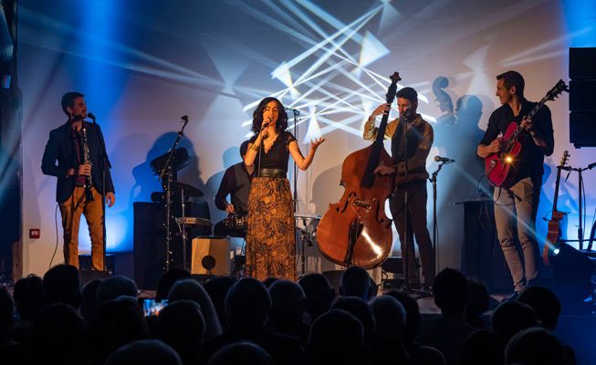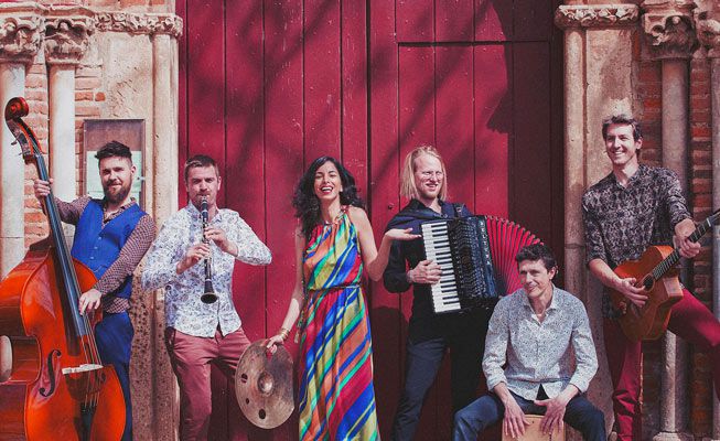 Their unique sound blends jazz and swing with Mediterranean culture, featuring female vocals, clarinet, accordion, guitar, double bass, and drums.