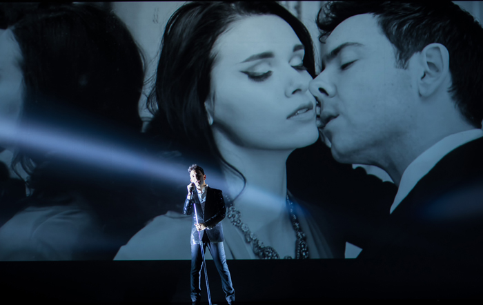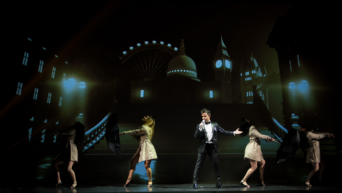 This exciting musical multimedia show focuses on the male singer's talents, with all music provided as high-quality backing tracks. The entire Hollywood Theme Multimedia Show is enhanced with stunning video content projected onto the screen behind him. This fully custom-made video content is generated for each part of the show, featuring sections the cover singer interacts with, similar to a video mapping performer.