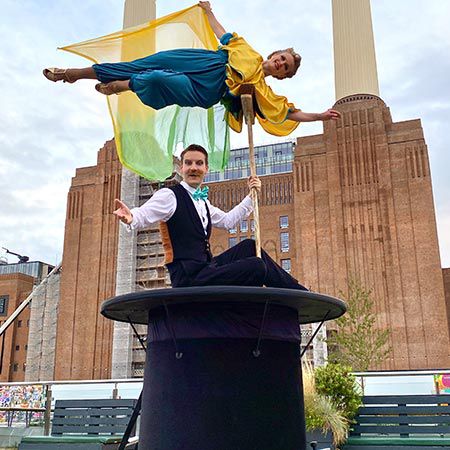 Our fantastic magic duo is the full package and can even provide an amazing giant top hat stage fully equipped with its own PA system, perfect for various events. From here, they can perform incredible acts, including their breathtaking balancing on the broom illusion, a sparkly tap dance, and a sassy escapology routine.