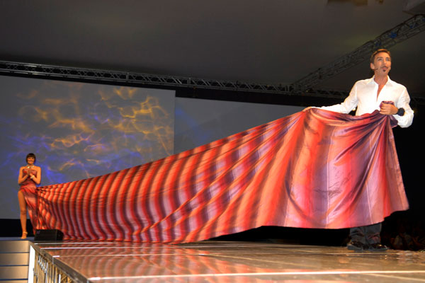 In this unique performance, the artist transforms a common concept (the catwalk) by creating stunning fashion masterpieces live on stage in just minutes, without cutting or sewing, using minimal materials!