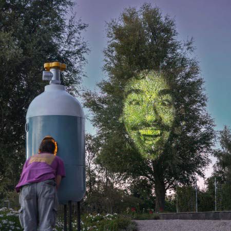 Experience nature like never before by putting your head into a large oxygen bottle that projects your face onto a tree crown, creating a giant tree face.