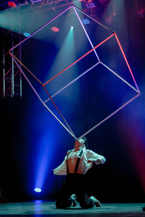 Returning to France three years later, Sergio created an awe-inspiring one-man show that blends circus acts, songs, and humor, always engaging with the audience. The International Cube Act features Sergio juggling an impressively large cube in sync with music and lighting, resulting in a spectacular performance that showcases both dance and strength.