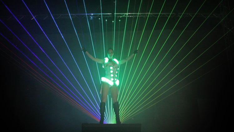 Book our Vegas laser act for corporate events and product launches. Easily customizable, our female laser performer can tailor her show to include logos and branding, and she can design a performance to complement specific music. She can adapt to any theme and has a collection of LED costumes with various options, with her light vest wearable over any outfit.