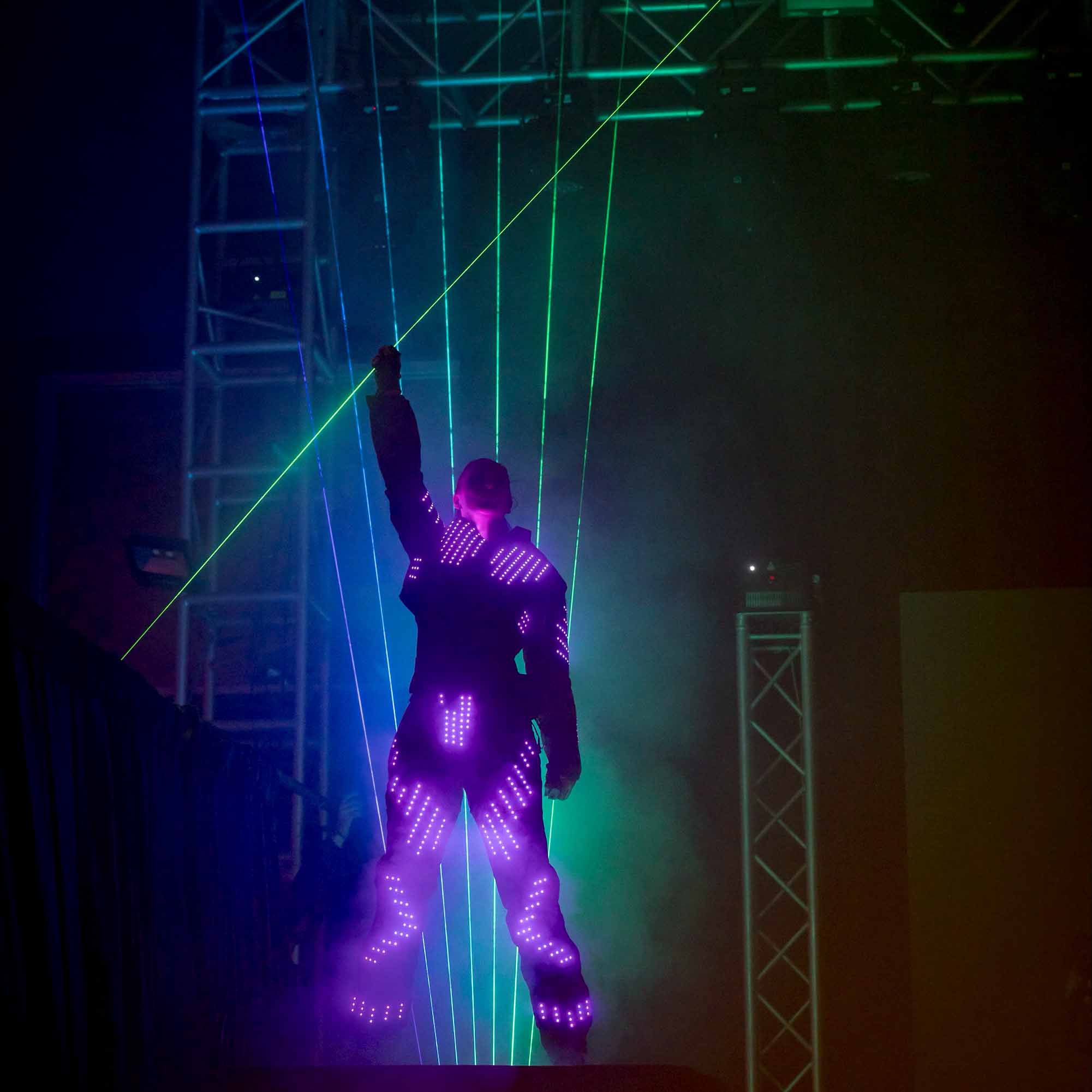 Performed by a female laser artist in a programmable LED suit synchronized with the lasers, this show adds an extra visual dimension, featuring 2 or 4 full-color lasers that create stunning visuals. Artistic, theatrical, and top-quality, our laser act offers premier laser entertainment.