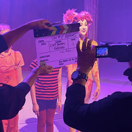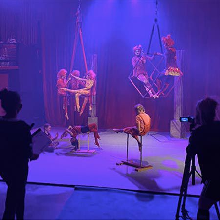 The pre-recorded performance is shot with 3-4 cameras (Canon 4K Vixia HF G50 Pro camera plus 2 other 4K cameras for additional shots and angles) in a professional theater equipped with LED stage lights, smoke machines, special effects, red velvet curtains, and props.
