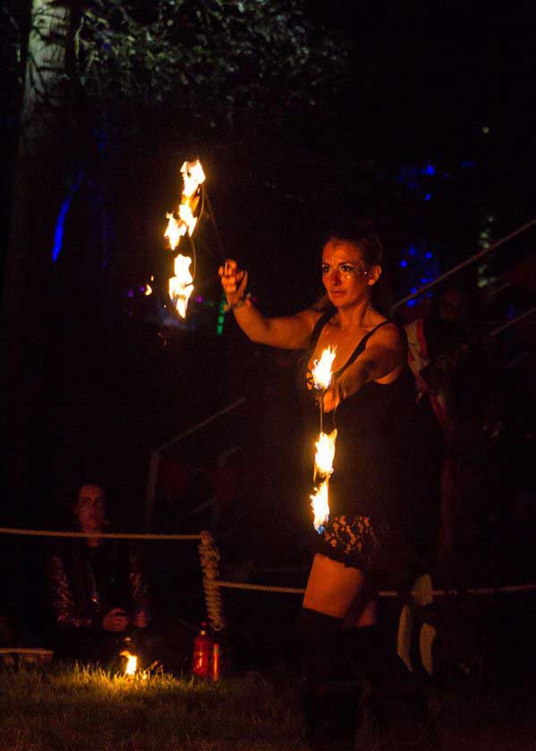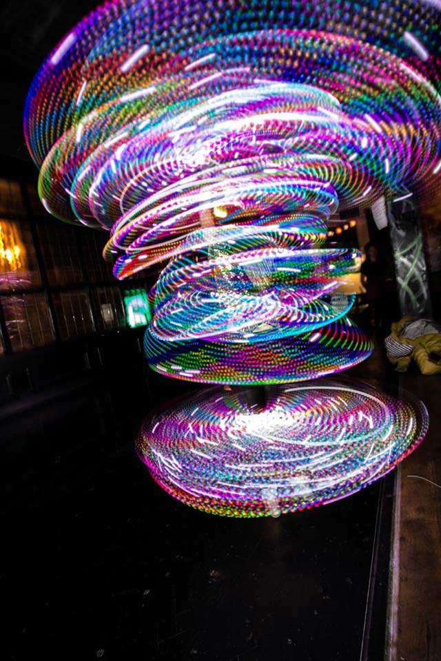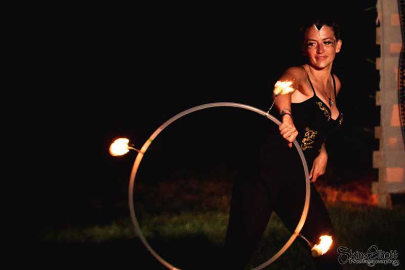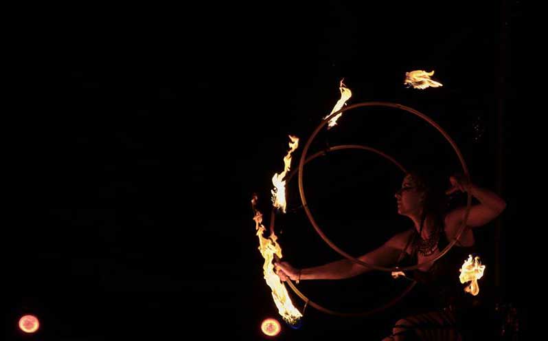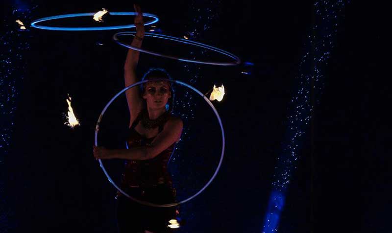 Our fire and LED act offers a wide array of options. Her LED hula hoops can be customized with any sequence of colors and lights to create a radiant tailored performance that any audience will adore. Our fire hula hoop act turns up the heat at any event, and her assortment of fire props, including fire palms, poi, and hula hoops, is perfect for dark indoor or evening outdoor events.