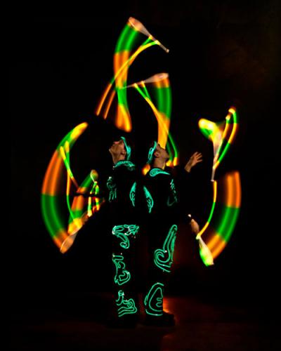 This LED Glow performance is perfect for cabaret shows, clubs, parties, late-night shopping, or any venue that needs brightening up. The show can be expanded to a 3 or 4 person routine, featuring light costumes and a mix of balls, clubs, poi, staff, hula hoops, and other illuminated objects.
