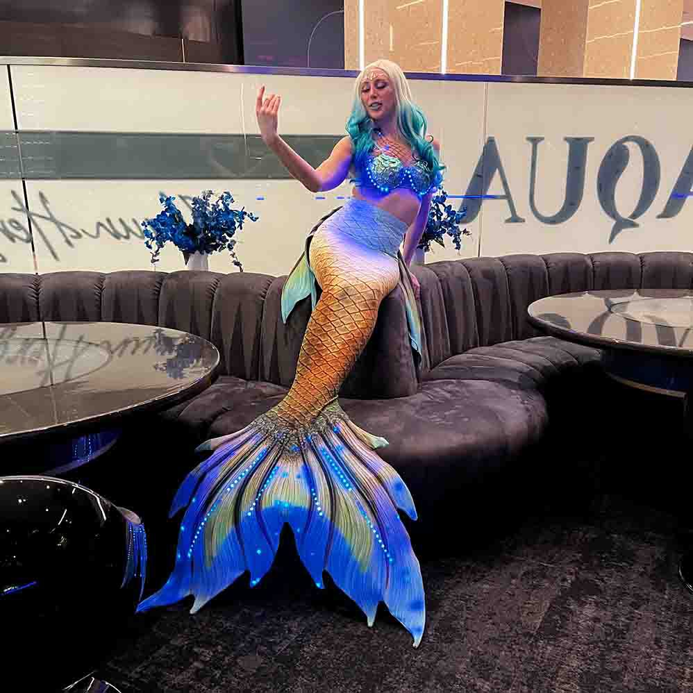 Mermaid performers feature LED tails and shell tops, making them a hit for meet and greet events with guests of all ages.