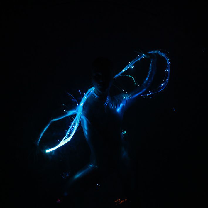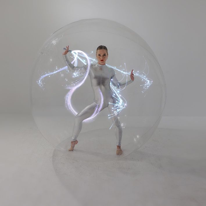 LED performer in a bubble gracefully moves within a sphere, utilizing LED lights to craft a futuristic look.