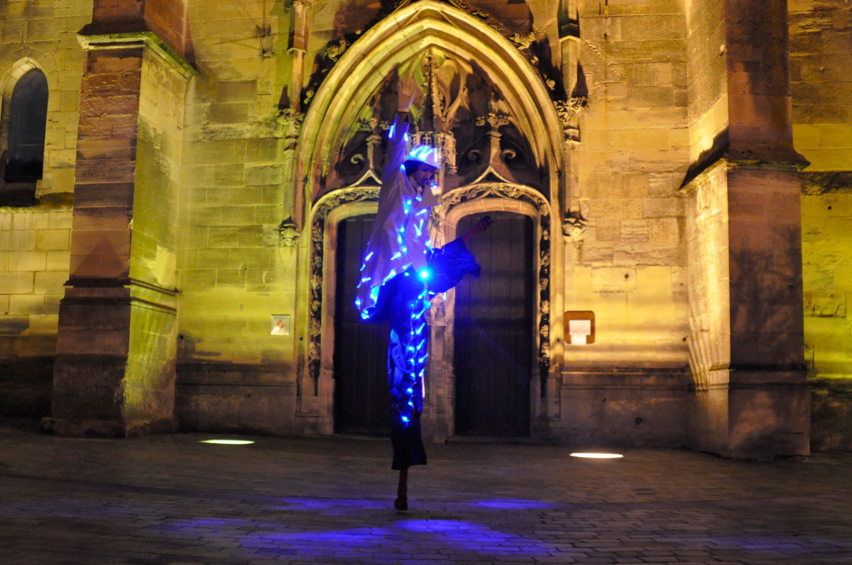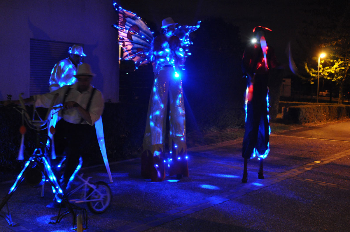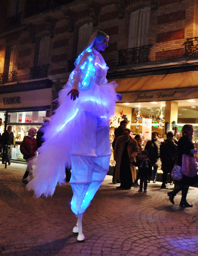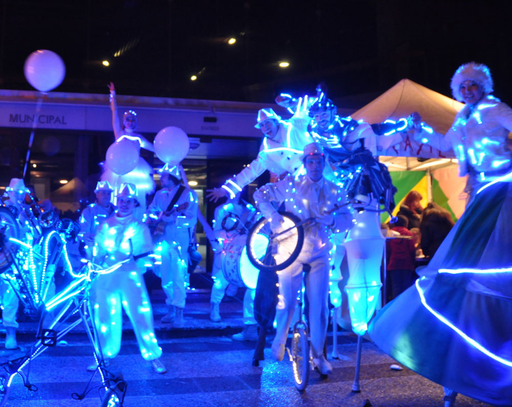 Dressed in white and adorned with dazzling blue and colored LED lights, this collection of stilt walkers creates a stunning spectacle that will transport spectators to another world!