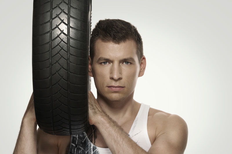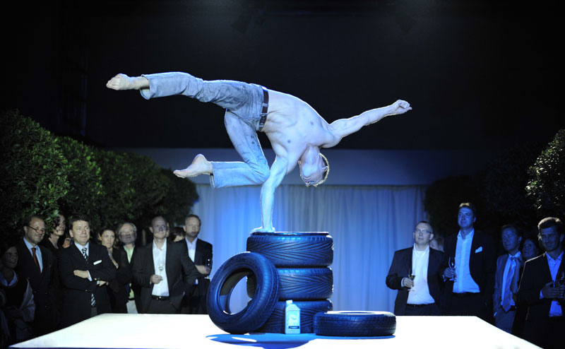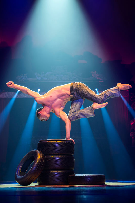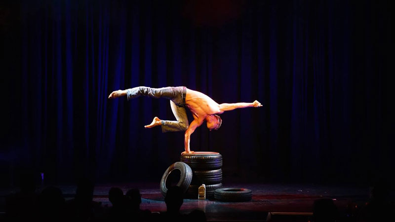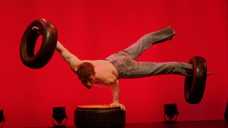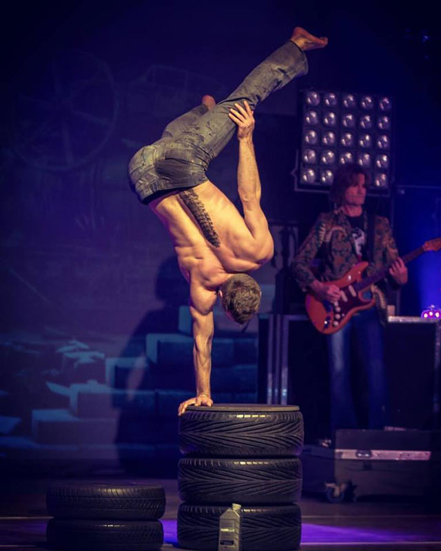 Using his tire and motor oil props, our male acrobat has crafted a unique stage show combining athleticism and a motorcar theme with handstands and hand-to-hand balance skills.
