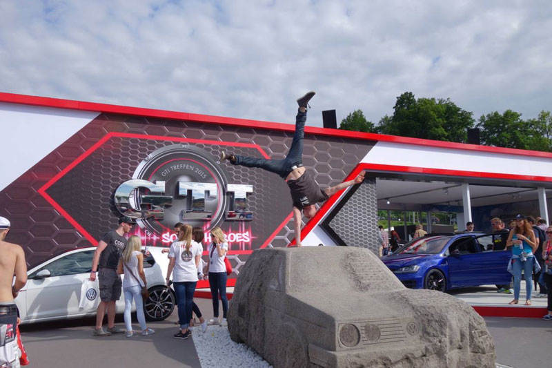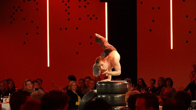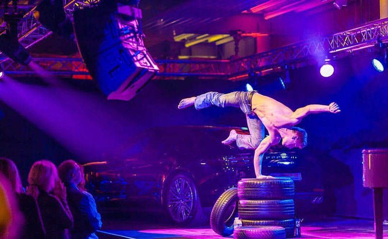 Equally comfortable on top of a car at a trade show or under the bright lights of a stage, our acrobalance artist delivers a fantastic performance no matter the setting.