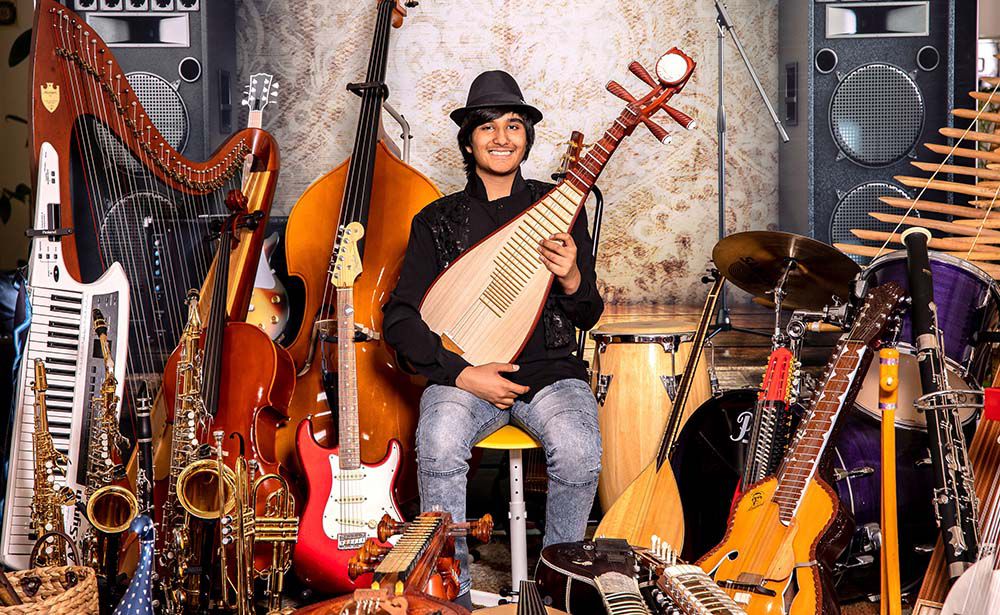 A highly talented young musician who can play 107 instruments from all around the world