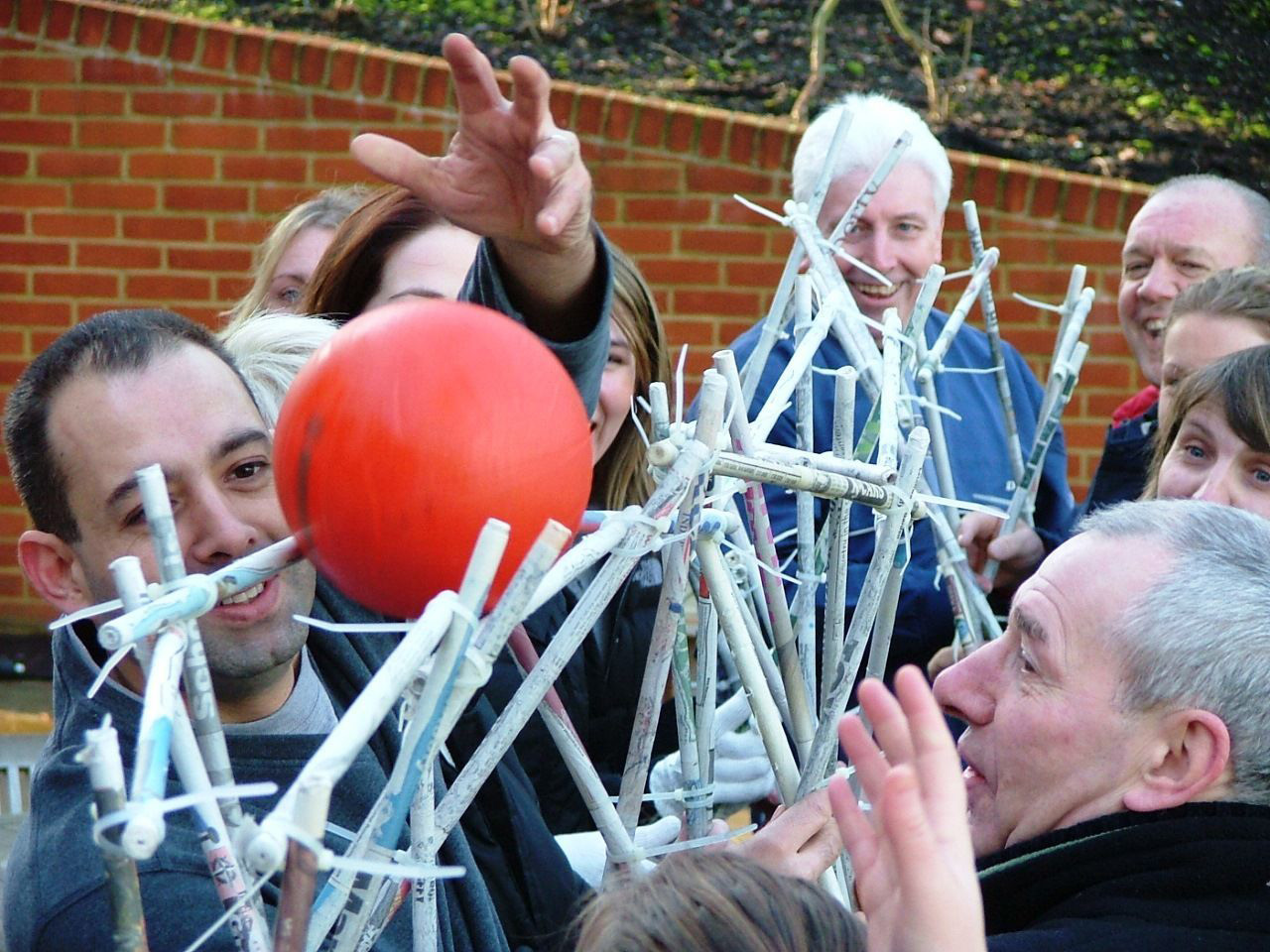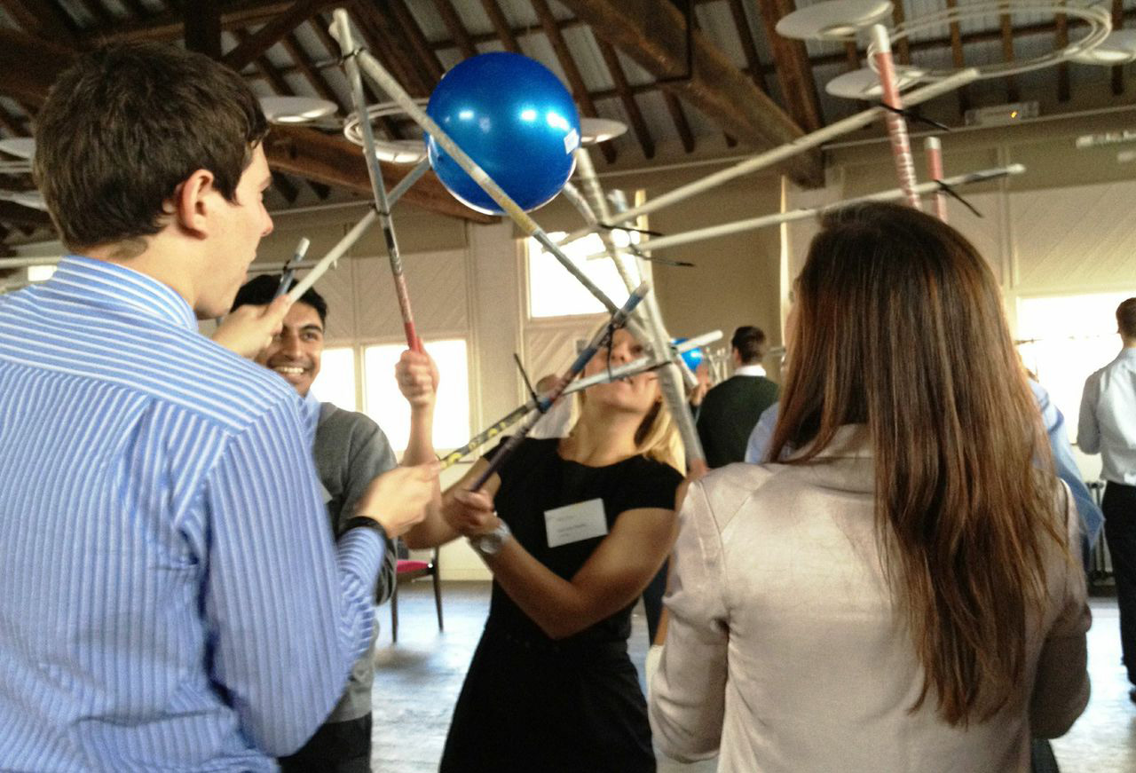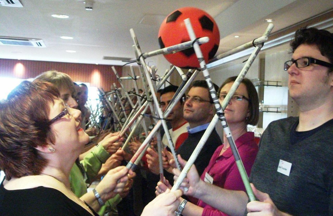 This railway track is delivered to teams in small sections, which they first need to assemble before connecting each piece to the people on either side of them. As the group raises and lowers their arms in unison, they can transport brightly colored balls around the room.