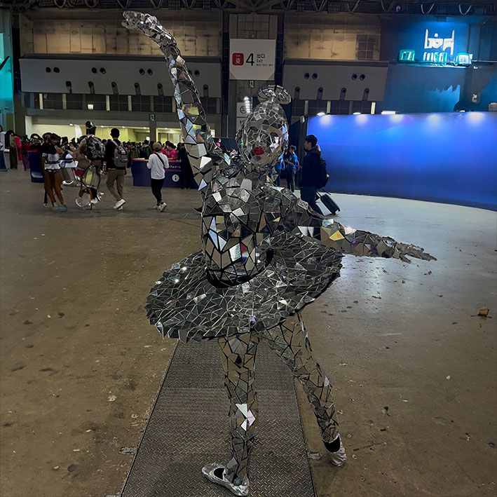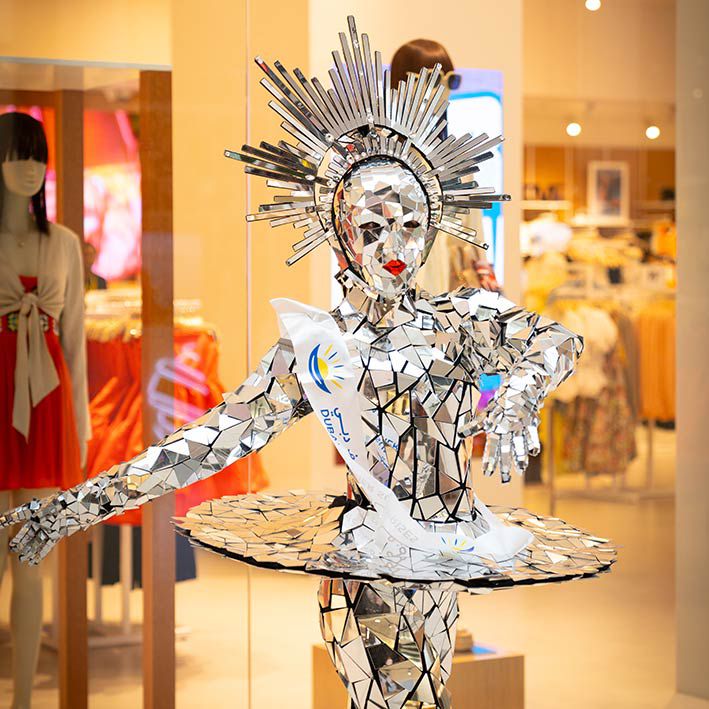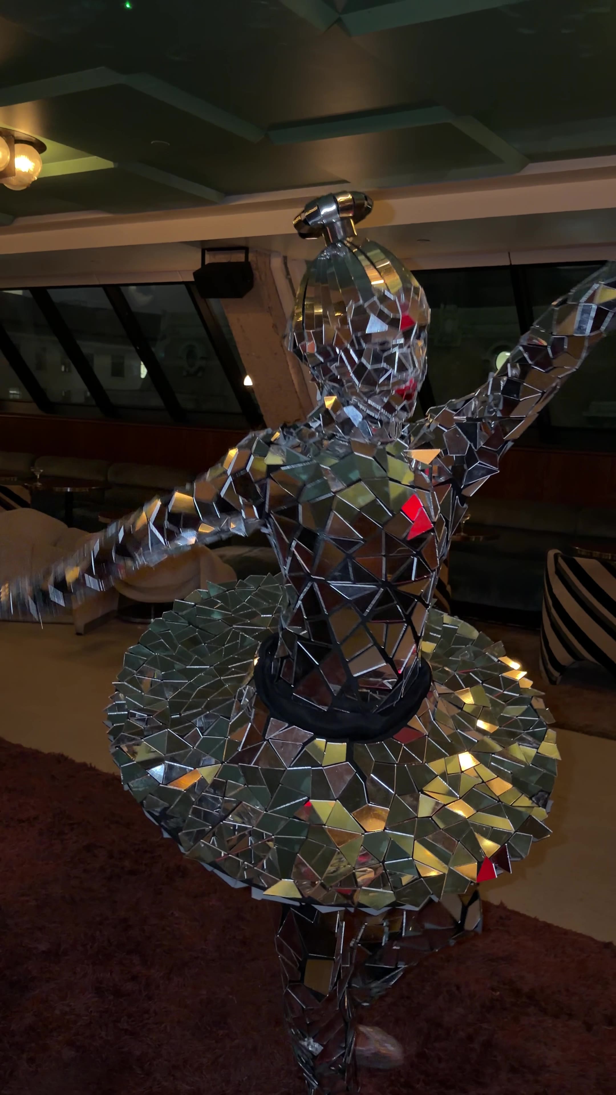 Dressed from head to toe in a mosaic of mirrors, these elegant performers reflect the light and atmosphere of the room around them.